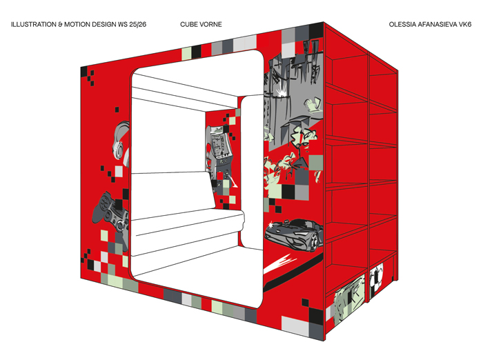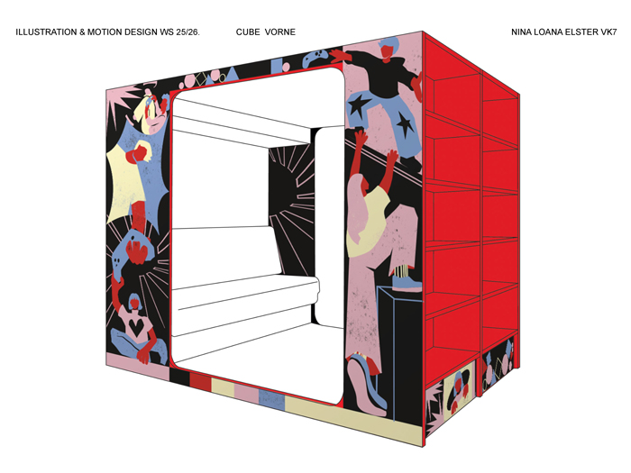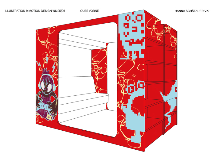 Entstanden sind die Entwürfe als Teil des Seminars „Illustration und Motion Design“ im sechsten Semester des Studiengangs Visuelle Kommunikation unter der Leitung von Prof. Tanja Krampfert. Zum Kick-Off besuchte sie mit dem Kurs die Stadtbibliothek. Dort erhielten die 10 Studierenden ein Briefing von Achim Schroth, Leitung Gamification bei der Stadtbibliothek. Die Aufgabe: Ein Design für die äußeren Wände des Cubes und die Comicwand zu entwickeln, das Jugendliche zwischen 12 und 18 Jahren anspricht und inhaltlich zu den Themen Gaming und Comic passt.