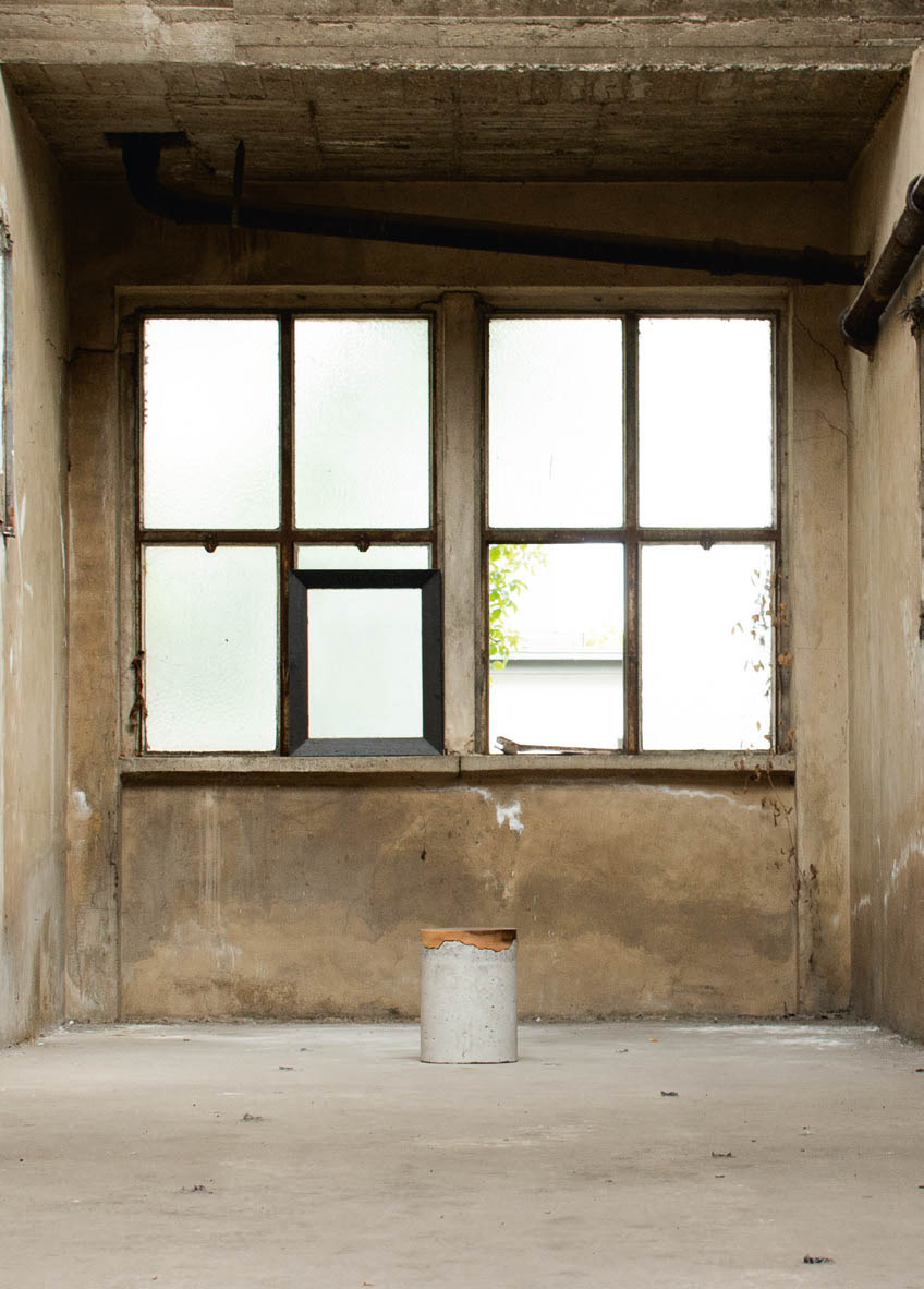 Foto eines minimalistischen Stuhls aus Stein in einem verlassenen Raum