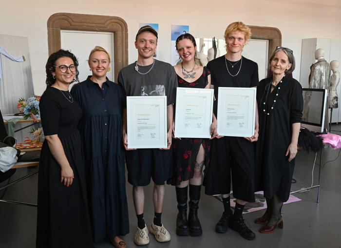Von links nach rechts: Libera Mayer und Evelyn Mohr von La Biosthétique, mit den Gewinner*innen Simon Bakenecker, Lilian Brade und Henning Sadau, sowie Mode-Professorin Sibylle Klose (Foto: Harald Koch)