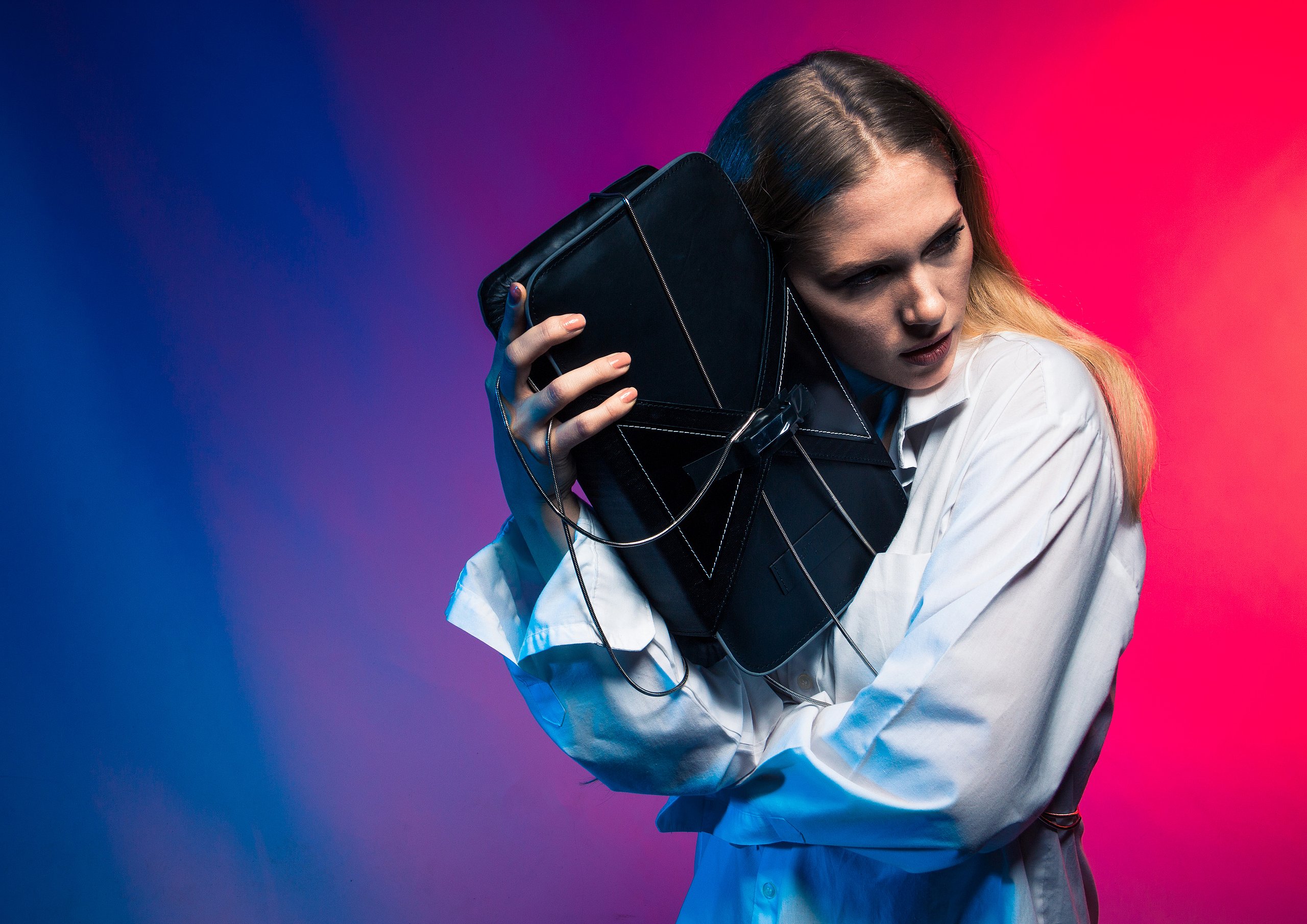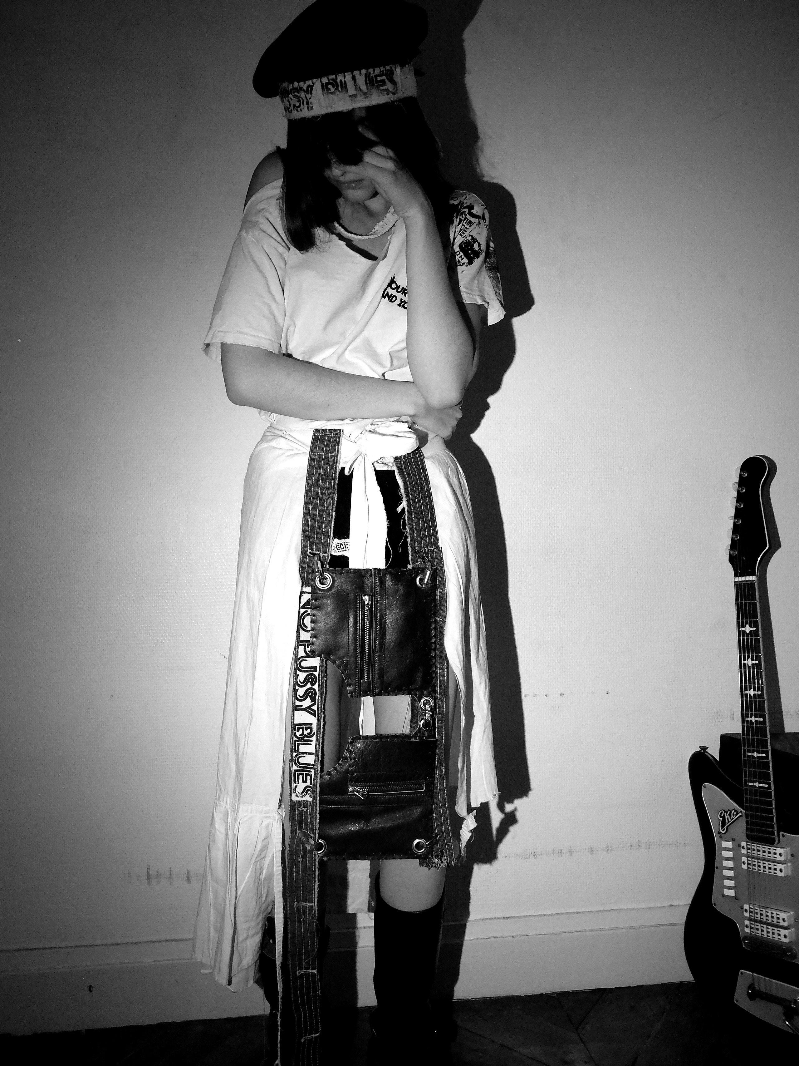 Basierend auf Kurt Schwitters Aussage, dass man den chaotischen Dadaismus als Übergang zur Veränderung ansehen kann und dass sich aus dem Chaos ein strukturierter Wandel ergibt, habe ich Verbindungen zwischen der Punk und Postpunk-Bewegung, sowie Konstruktivismus und Dadaismus untersucht.Dadaismus und Punk bilden das Chaos, während Konstruktivismus und Postpunk die strukturiertere, mehr entwickelte Version ergeben. Die Lebensgeschichte und Persönlichkeiten der vor allem musischen Vorbilder liefern viel Input für die Kollektion. Für die Formensprache bietet sich eine Kombination aus Dada Chaos und strukturiertem Konstruktivismus an. Strukturierter Wahnsinn, wenn man so möchte. Aus den Gemeinsamkeiten und Ableitung voneinander entwickelt sich die Stimmung. Zerrissene Kleidungselemente geben den radikalen, aufsässigen, chaotischen Geist der Dadaisten und Punk Bands wieder, während geometrische Ledertaschen den mehr strukturierten, industriellen Charakter der Konstruktivisten und Postpunk Bands darstellen.