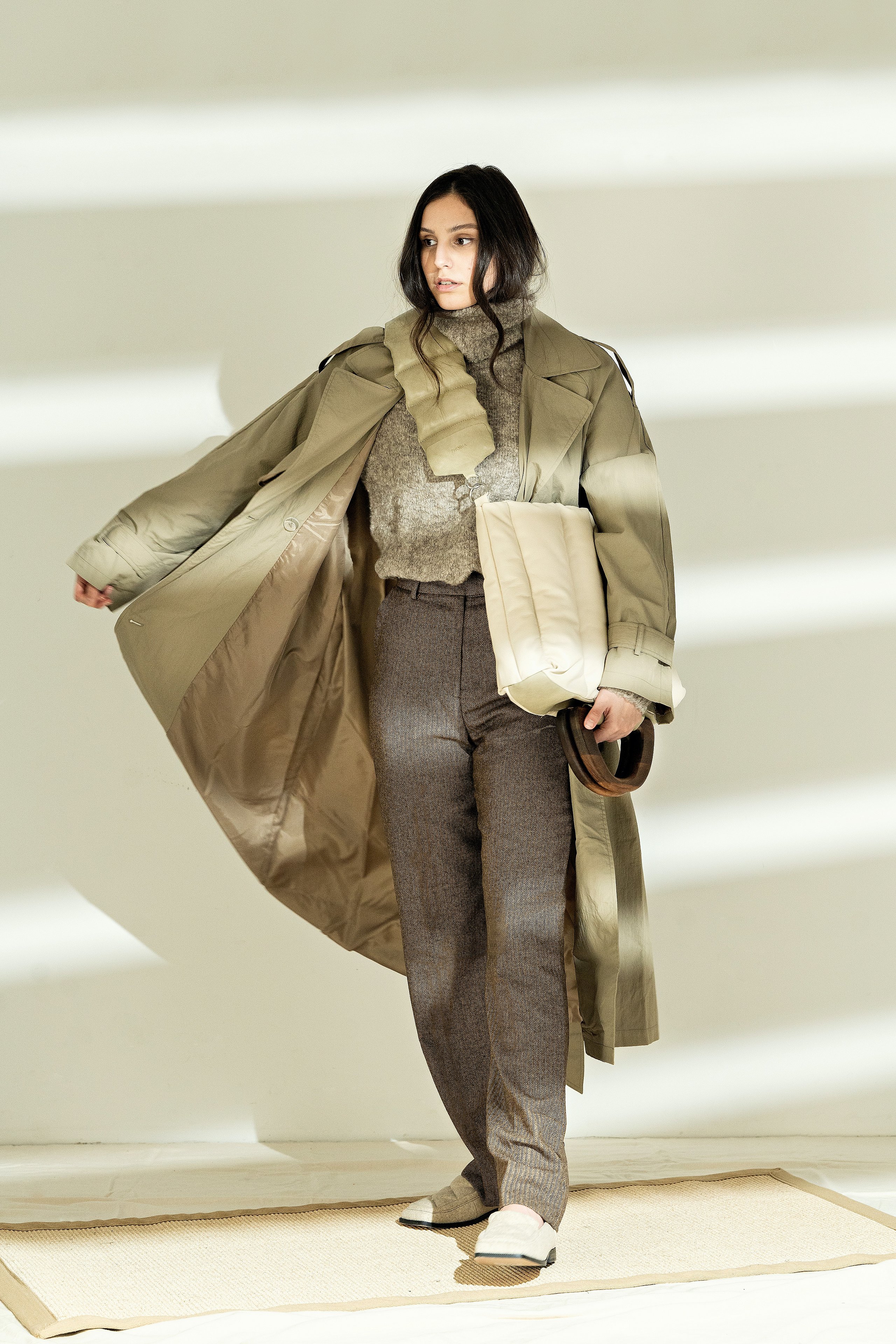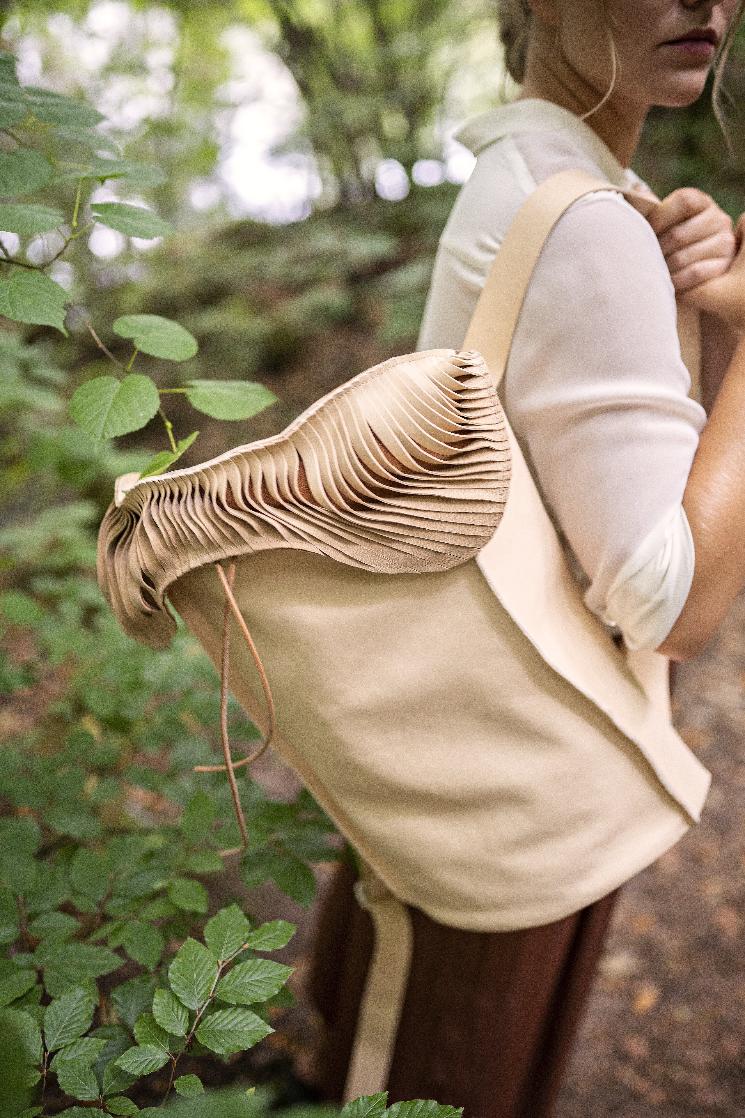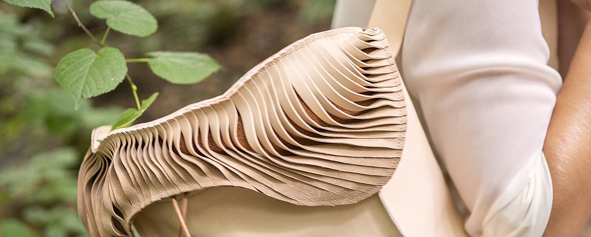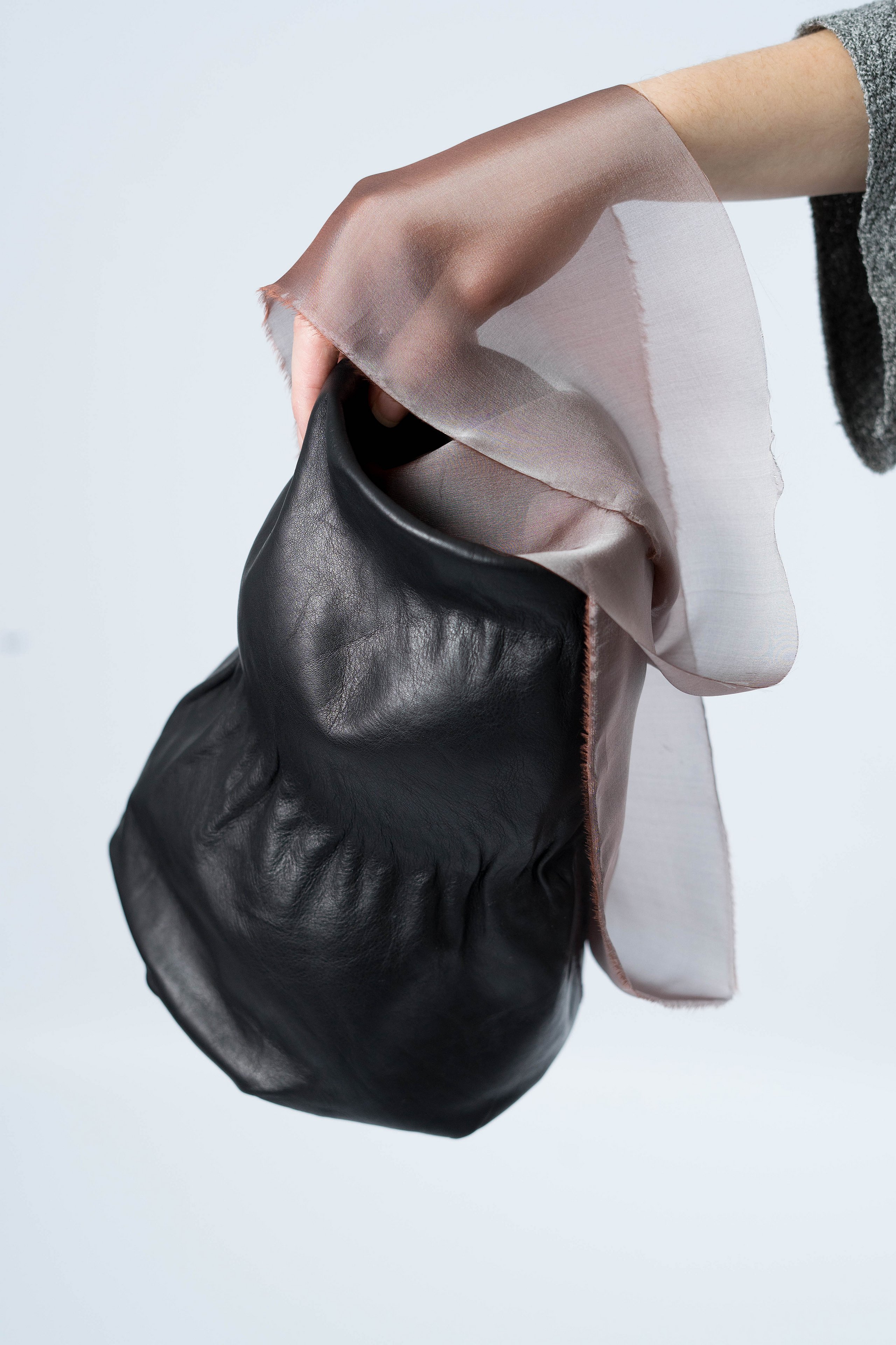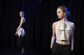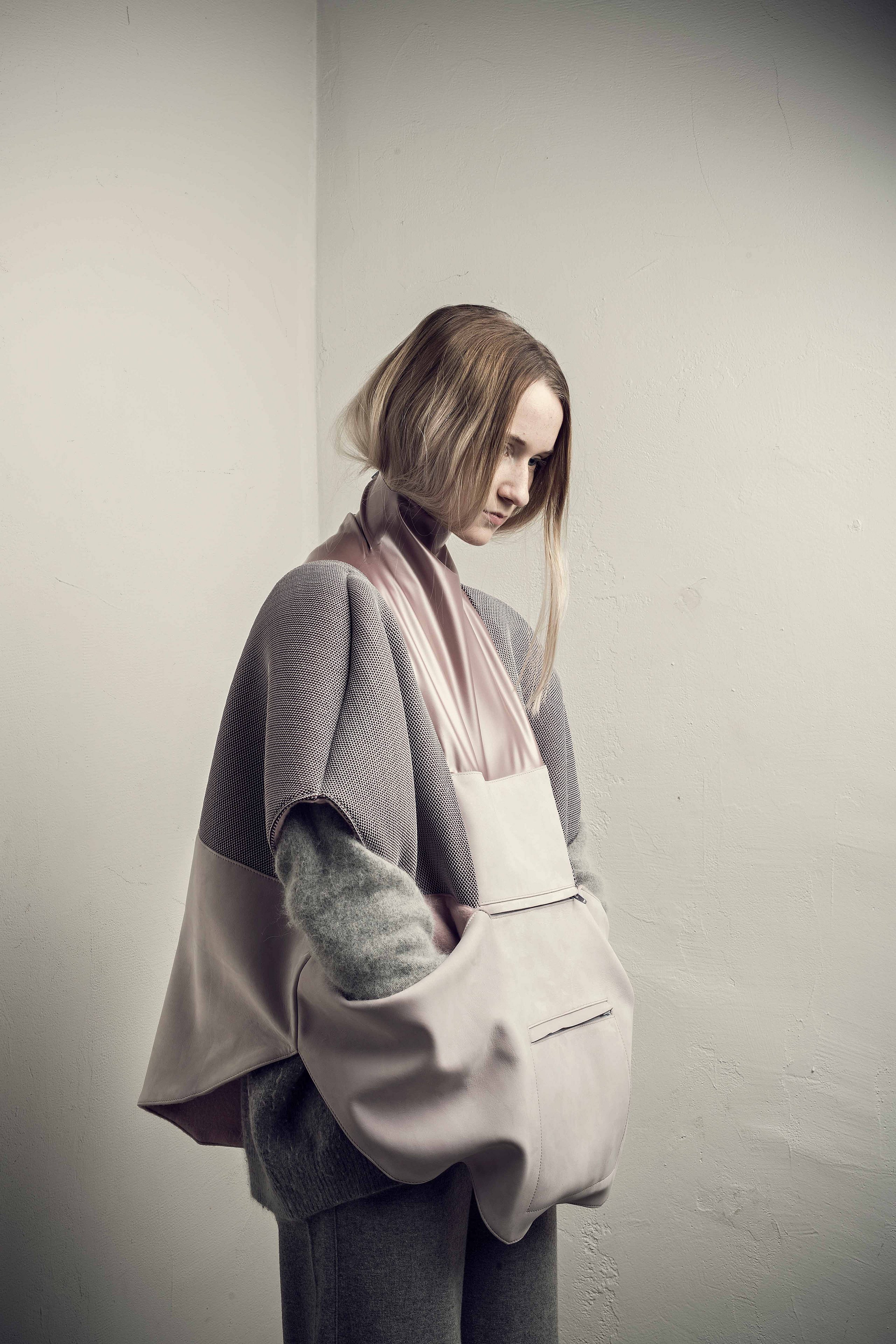 Was wir in uns haben, tragen wir nach außen. Nach eigenen Werten ausgewählte Objekte verkörpern diese, machen sie für andere sichtbar und beeinflussen wiederum das Innen anderer. Die genaue Wahrnehmung der Welt und Betrachtung dessen, was sie bewegt und in sich hält sind zum Leitgedanken dieser Kollektion geworden. Formen, in denen Innen zu Außen wird, oben zu unten und starr zu weich. Fertigungstechniken, die ganze Silhouetten bestimmen und akzentuiert eingesetzt zum genauen Betrachten einladen. Materialien, die sich anschmiegen und ihre Benutzung sichtbar machen. In der Kollektion „aora“ sind Accessoires entstanden, die Bindung zum Träger aufbauen, in ganzheitlichen Volumen und puren Linien um den Körper gelegt. Eine Kollektion zur ruhigen Wertschätzung von Handwerk und dynamischer Schönheit.