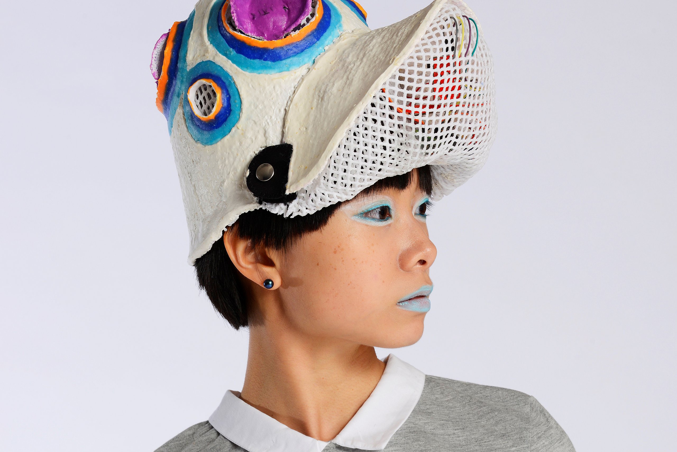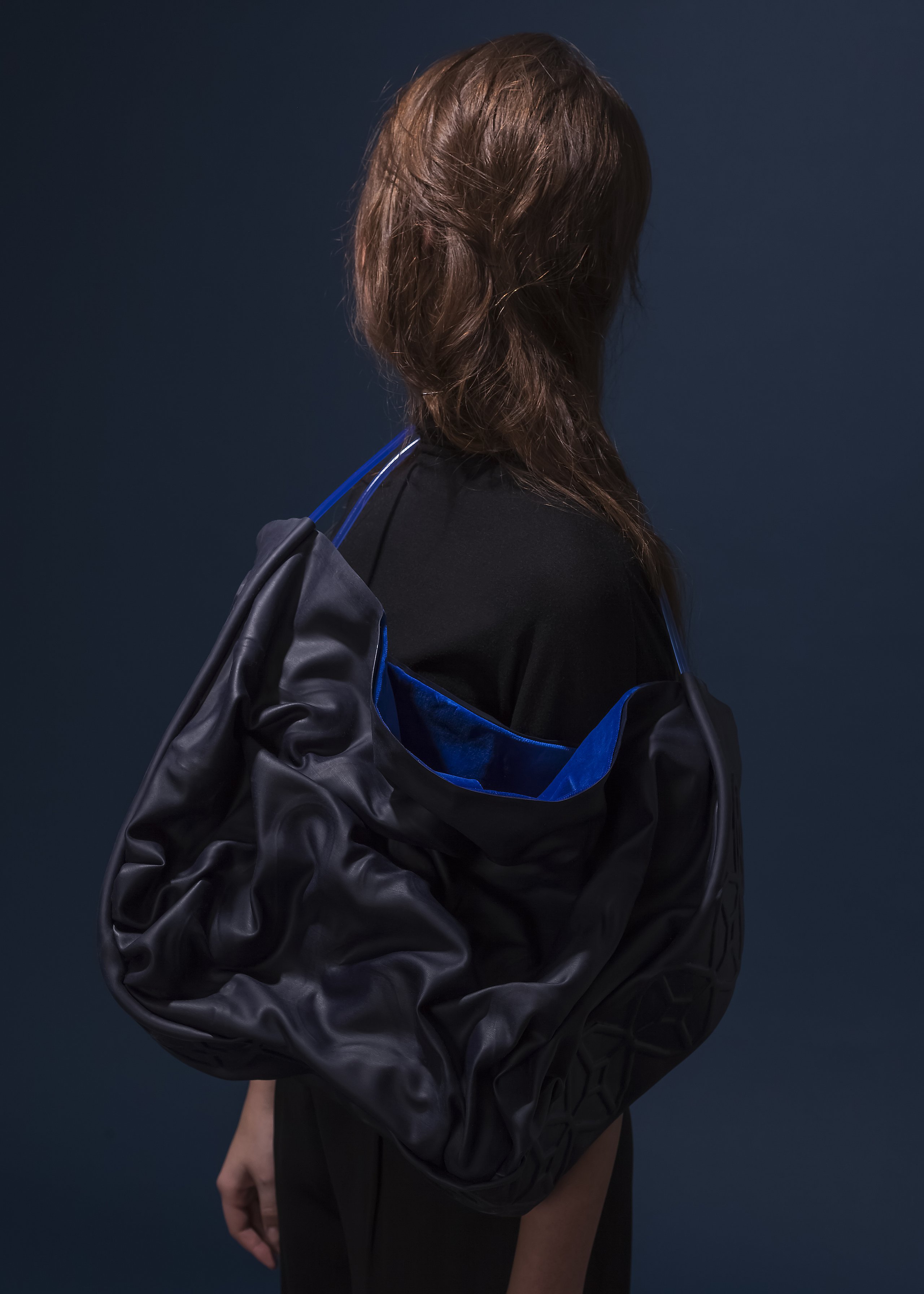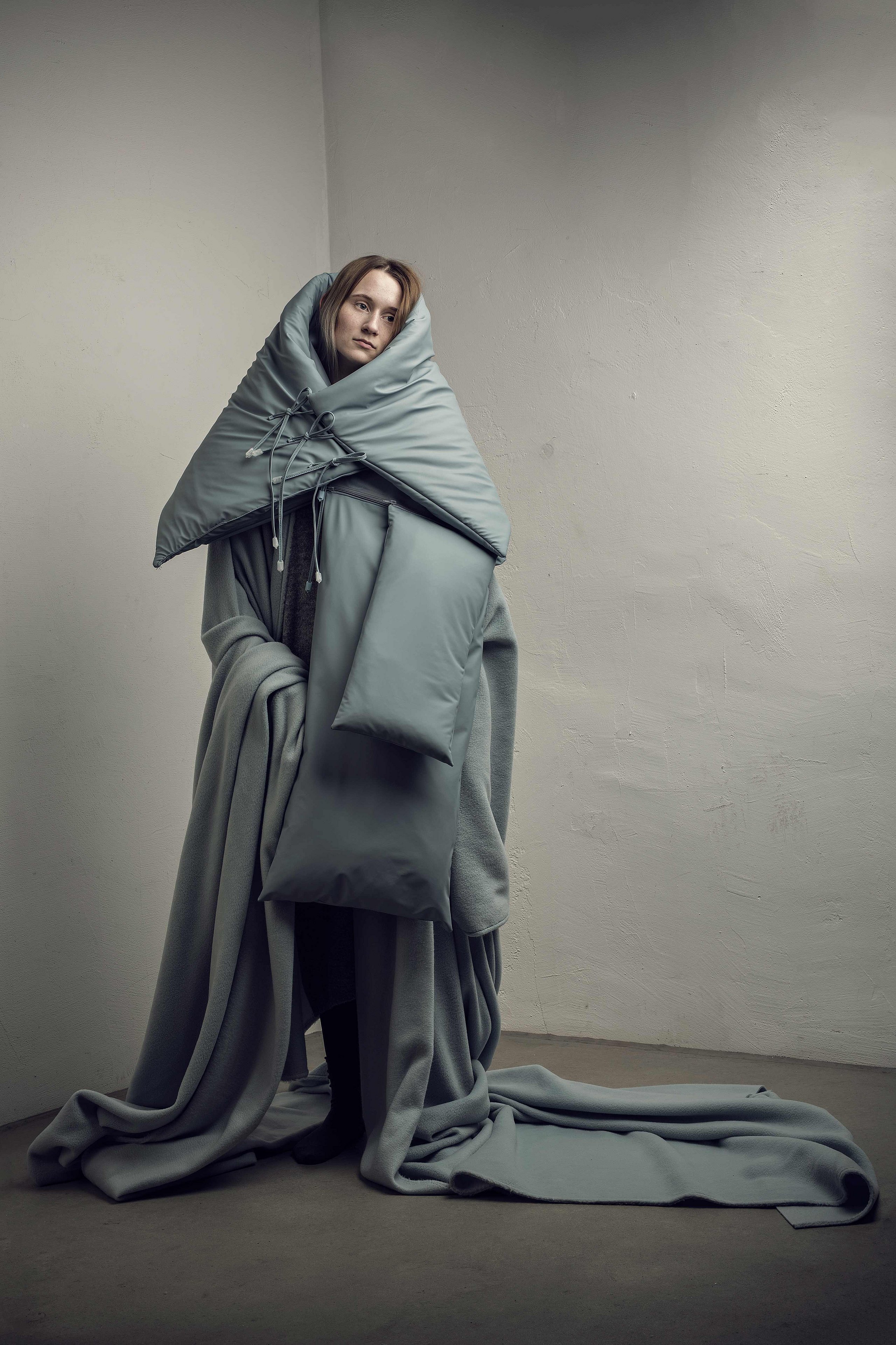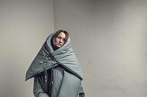 Als grundlegende Inspiration der Kollektion „Hibernate“ von Annika Mette Sorg dienen die Aspekte des Winterschlafes.? Wie Nester sind sie nach innen weich gefüttert und grenzen den Körper durch den Einsatz von Latex gegenüber der Umgebung ab. Starke Wattierungen und dreidimensionaler Strick verstärken den polsternden und schützenden Charakter. Manche Accessoires können durch Modifizierung auch als Wohnaccessoires genutzt werden. Die Trägerin erfährt Momente der Entschleunigung und Bewusstwerdung des Selbst. Durch das Tragen der Accessoires wird eine bewusste Entscheidung über Bewegung und Nichtbewegung überlassen.