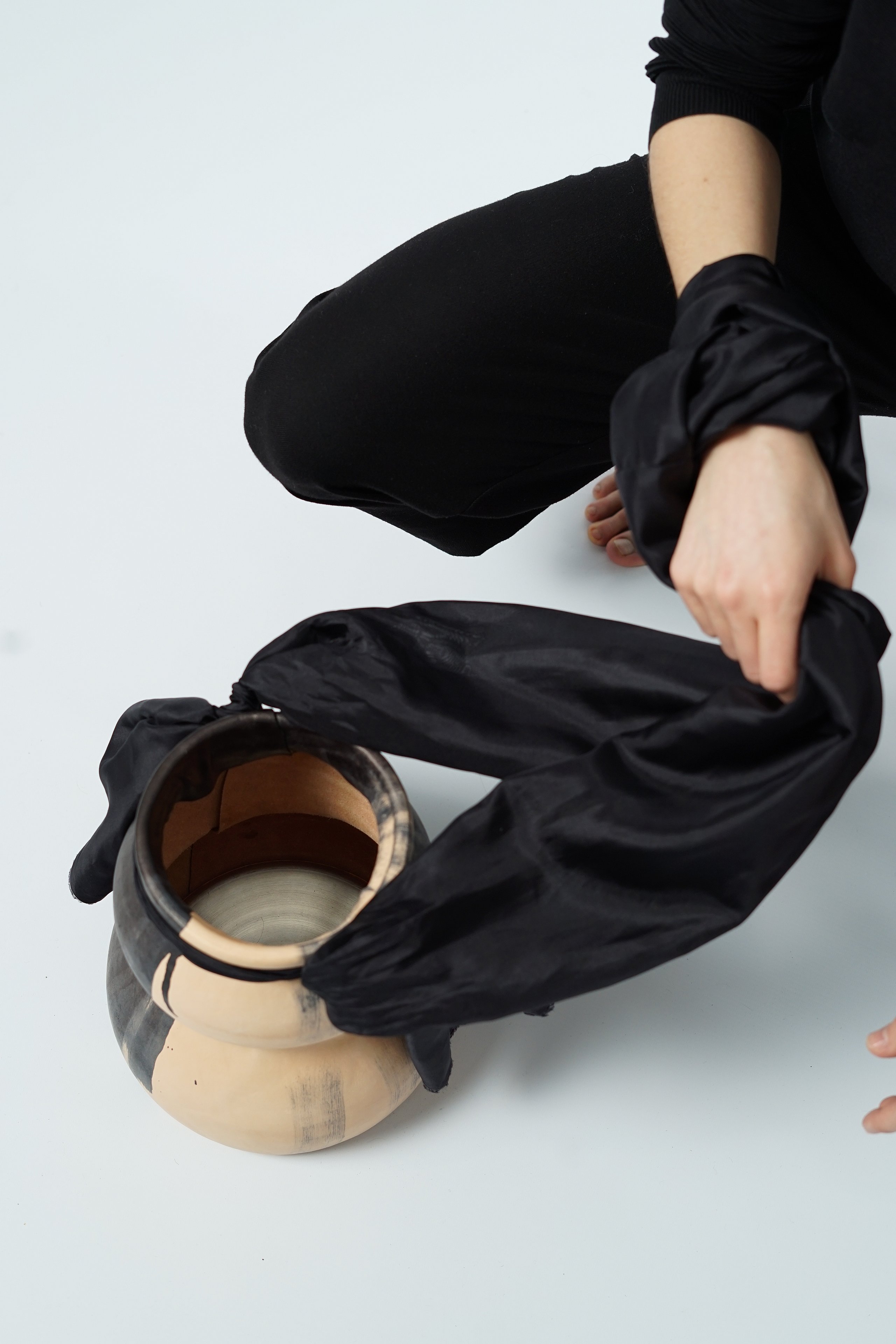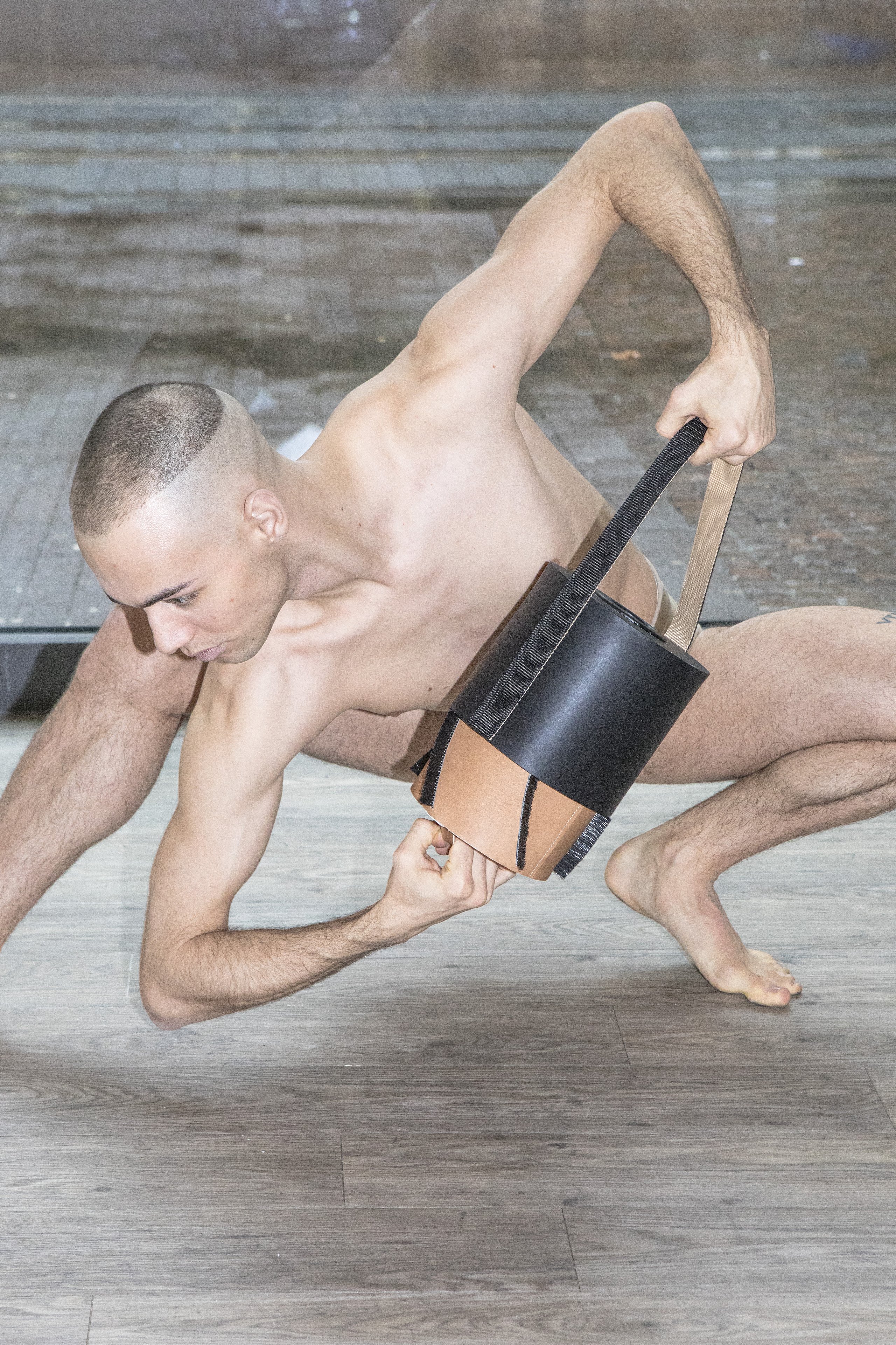 The accessory has a bigger influence on our moving habits than we are aware of. The idea was to create accessories where the wearer has to perform a certain movement while using the accessory.