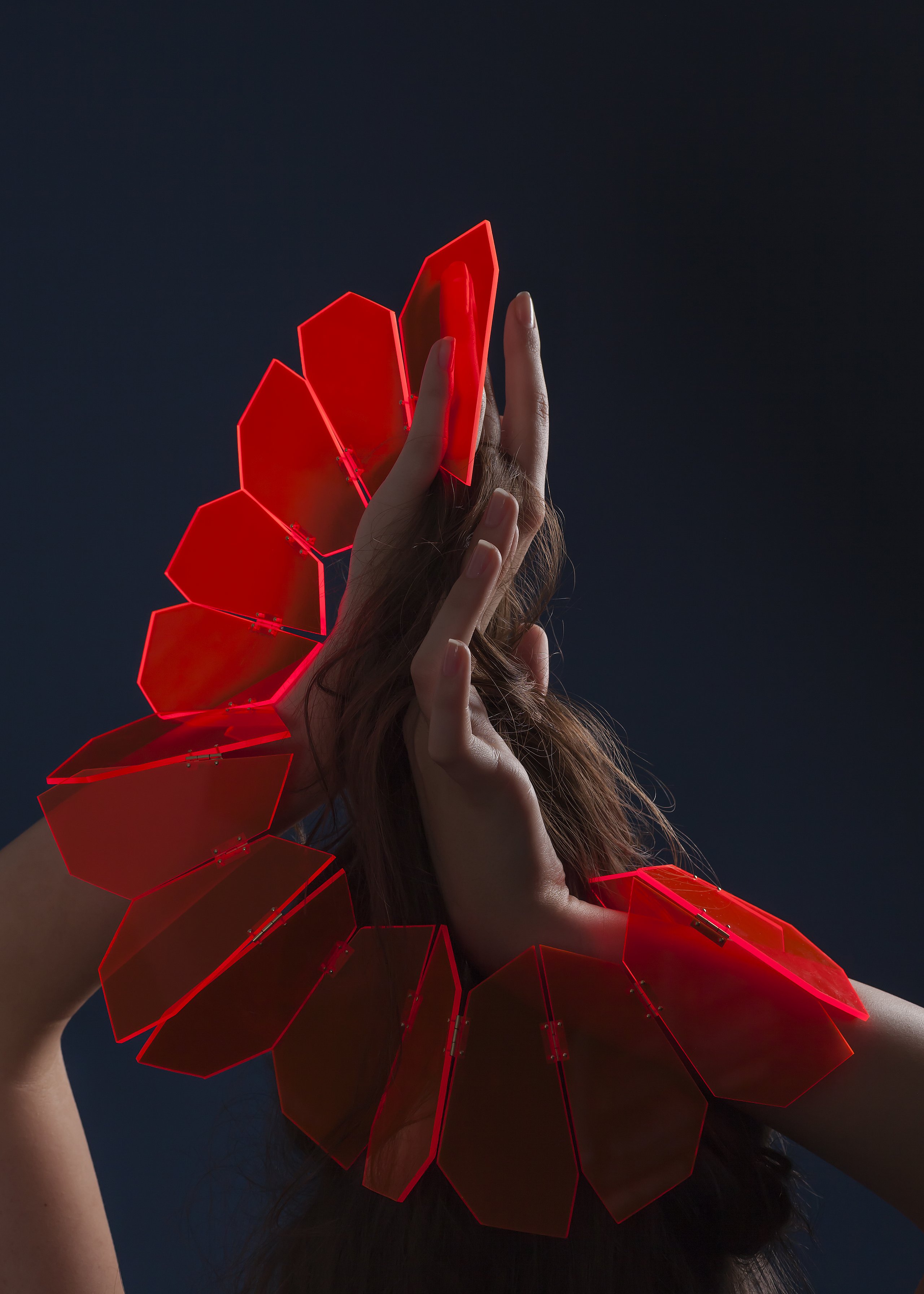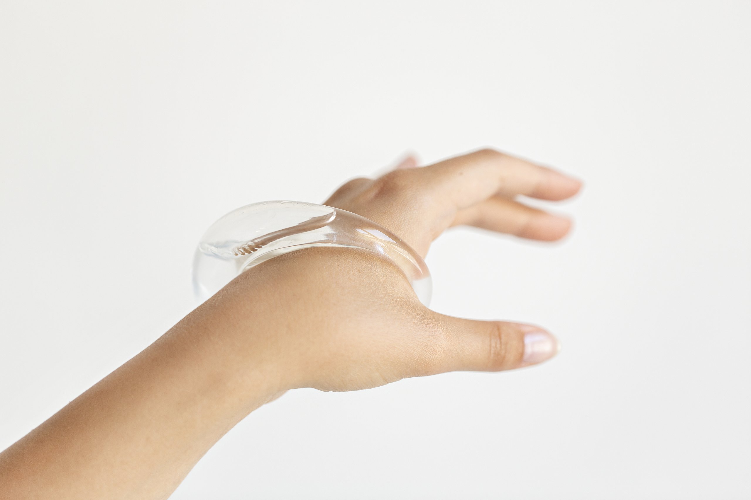 Das für die Accessoires verwendete Hauptmaterial Kunstglas hat sozusagen eine künstlerische Vorgeschichte, bevor es zum eigentlichen Designprozess kommt. In meiner Kollektion wollte ich die Ästhetik meiner vorangegangenen, entstandenen Zeichnungen aufgreifen, das fragile und zugleich statischen. Im Plexiglas hatte ich das Material gefunden, das in seiner Eigenschaft eine statische und fragile Ästhetik aufzeigt.
