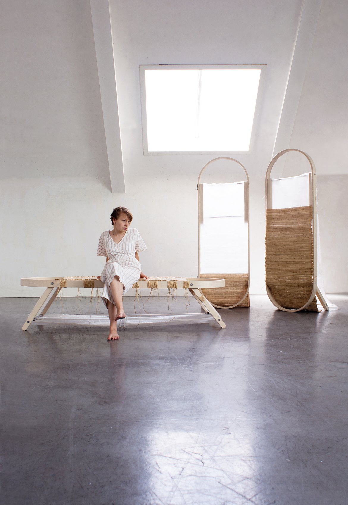 Diese Fragen bildeten für Arianne Schwarz die Grundlage für die Gestaltung ihrer Raumteiler - Module. Ihre Intention war es, ein Produkt zu gestalten, welches innerhalb eines gesetzten Rahmens Platz für Variation, Abweichung und damit auch für das Neue lässt. Das Weben der Trenn- bzw. Sitzflächen als Sinnbild einer andauernden Wiederholung lässt das Fortschreiten der Zeit sichtbar werden. Zeit, die sich im Raum manifestiert und im Endprodukt eingebunden ist. Räume, die sinnlich in ihrer Materialität sind und zum Verweilen auffordern.