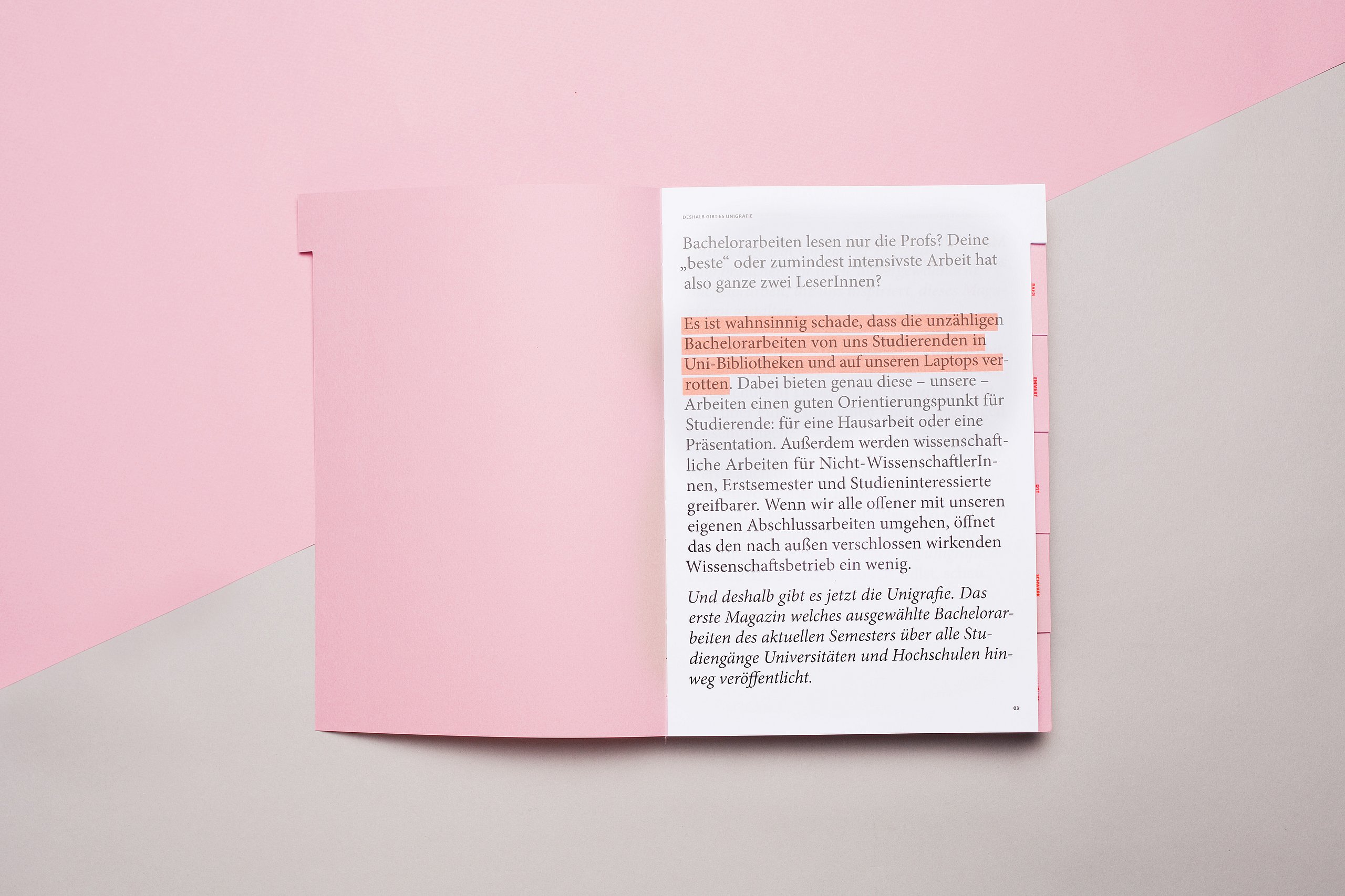 Im Rahmen dieser Bachelorarbeit ist ein Magazin entstanden, welches eben diese Macht, die Namen haben, in Form von persönlich erzählten Geschichten und faktenbasierten Artikeln aufzeigt. Es nutzt die Nahbarkeit, die das Thema „Namen“ hat, um auf gesellschaftliche Missstände aufmerksam zu machen, ohne dabei belehrend zu sein. Über verschiedene analoge und digitale Medien fördert das Magazin eine gezielte Auseinandersetzung mit dem Thema.