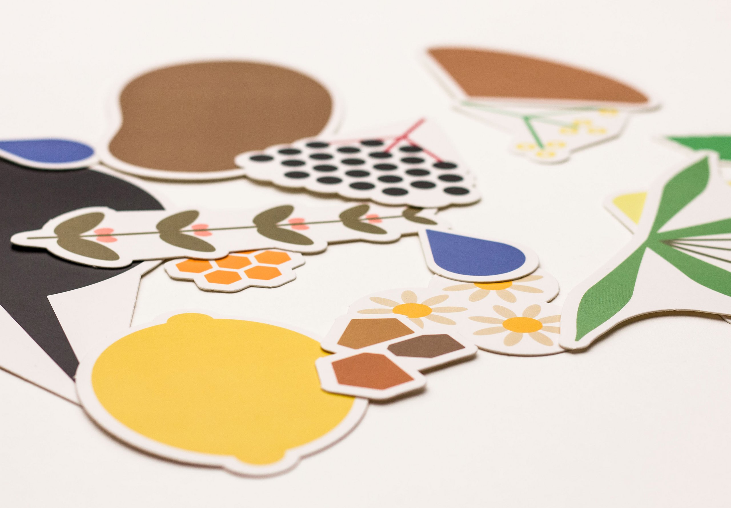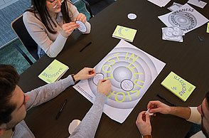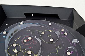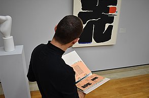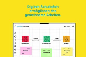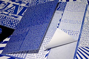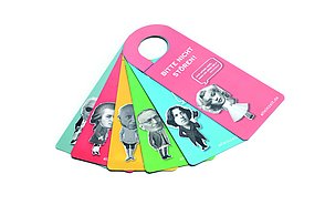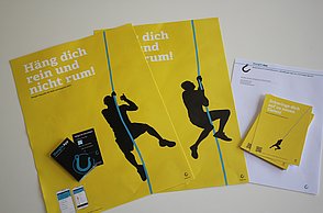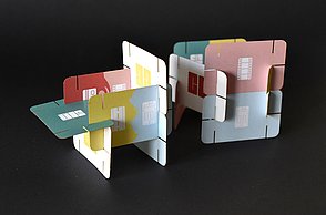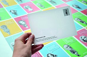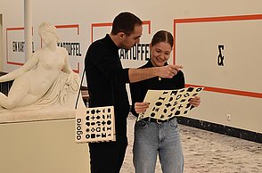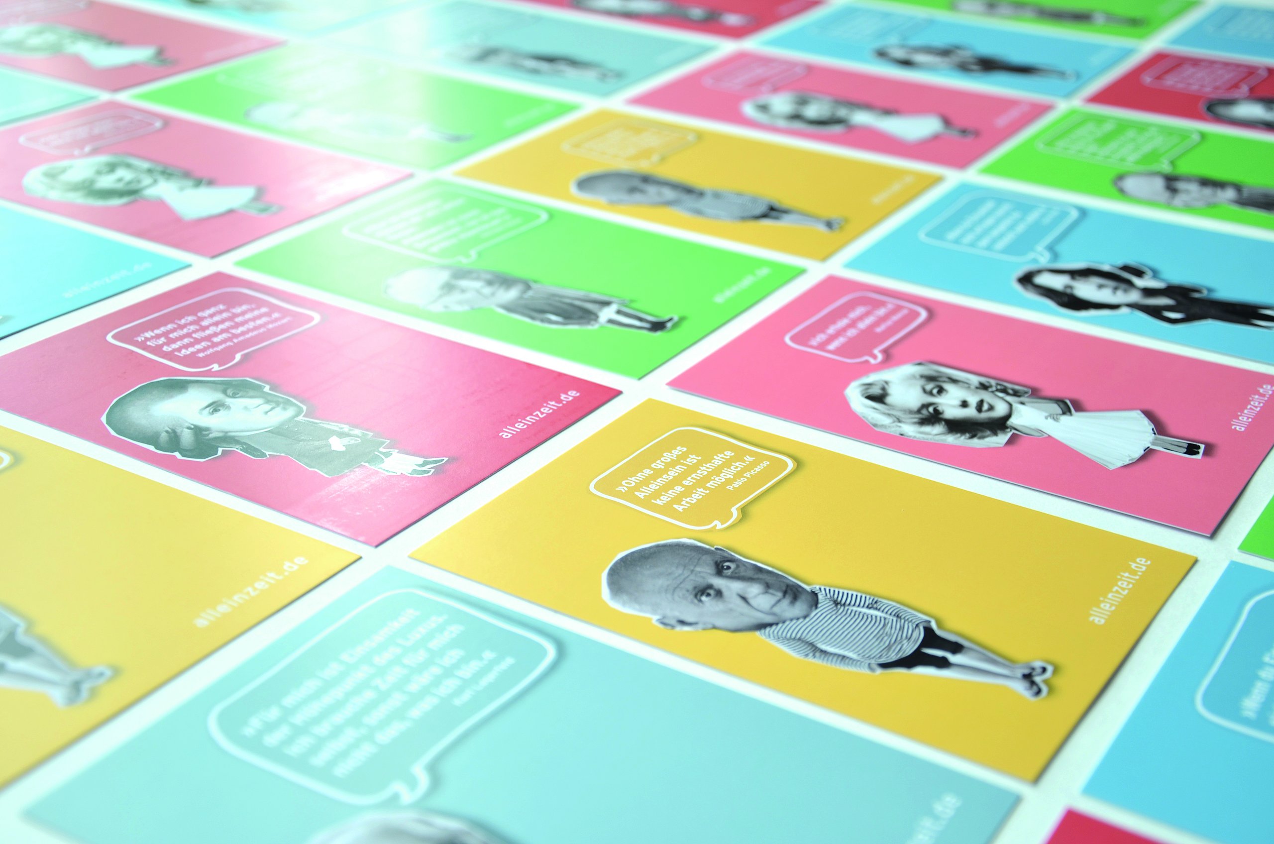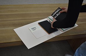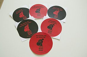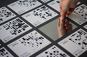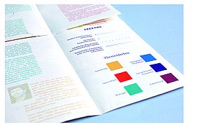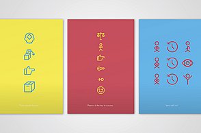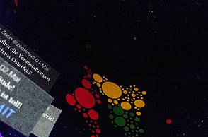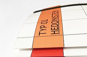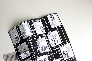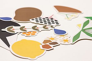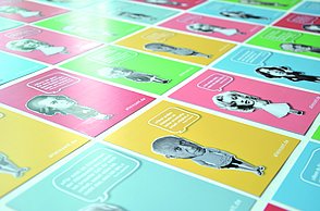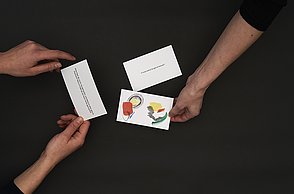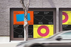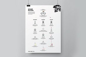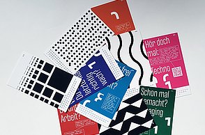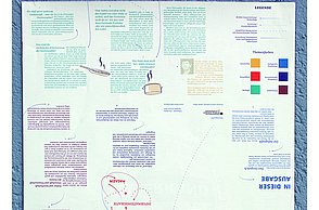 Das Plakat setzt ergänzend dazu ihre Hauptaussagen und ihre Designerpersönlichkeiten in Beziehung und verschafft einen Überblick über ihr Verhältnis zueinander. Auf den Stickerbögen befinden sich einzeln ablösbare Elemente aus den Arbeiten der Grafikdesigner. Das kreative Prinzip des in Beziehung Setzens soll somit erfahrbar gemacht werden.
