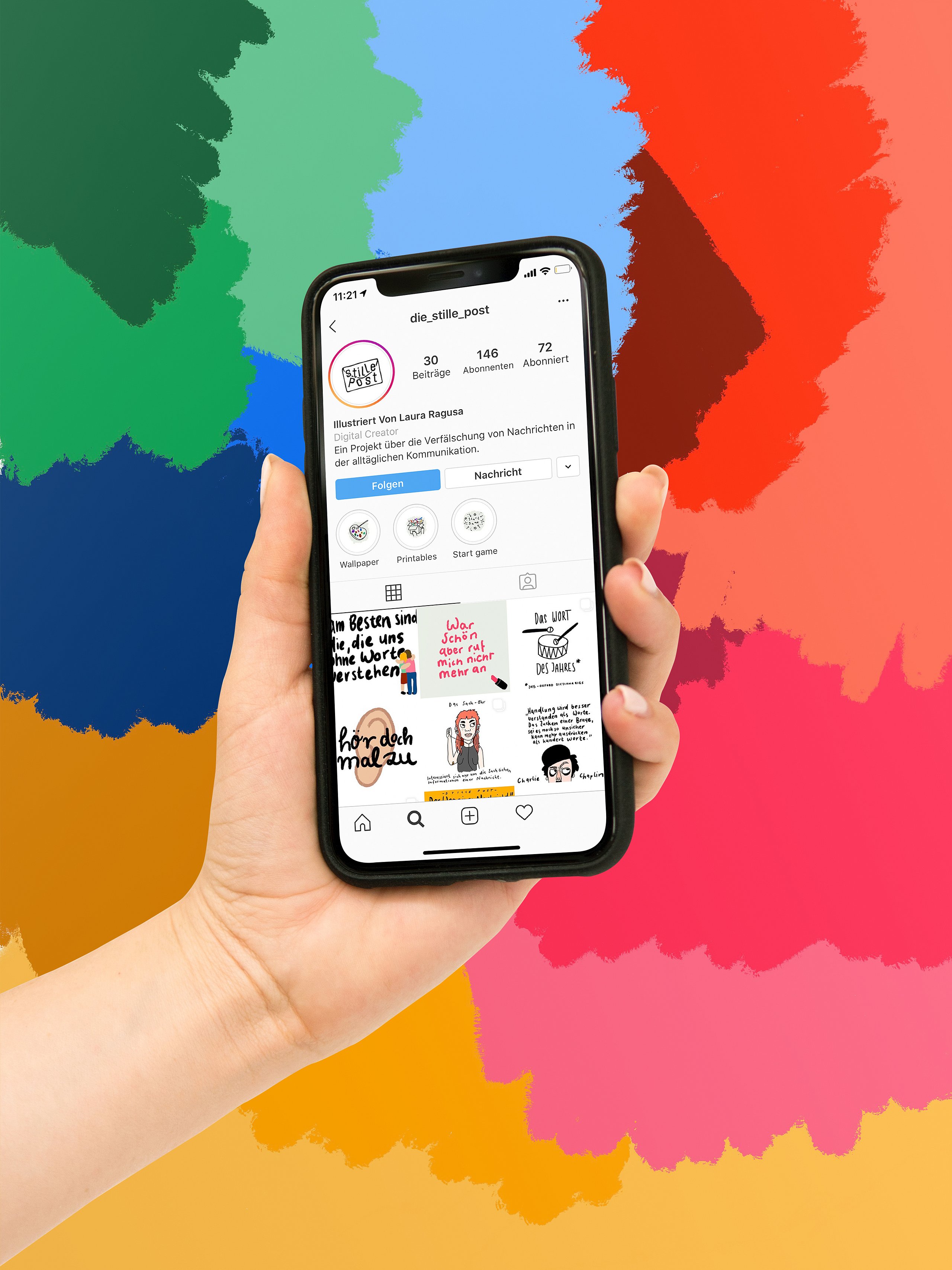 Ein Illustrierter Instagram-blog erklärt uns wie unsere alltägliche Kommunikation zu dieser Verfälschung von Nachrichten führt. Dabei werden Alltagssituationen satirisch durch Illustrationen beleuchtet. Der Instagram-blog "die_Stille_Post" bietet Raum zur Kommunikation. Humoristische Beiträge zur Verfälschung von Nachrichten, die sich über Alltagssituationen bis zu Theoretischen Gedankengängen erstrecken, beleuchten wie wir Dinge manchmal Missverstehen.