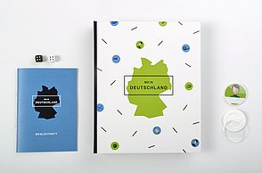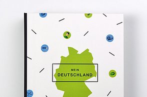 Damit das Lernen auch Spaß macht, verzichtet die Grafikerin aufgrund ihrer persönlichen Erfahrungen bewusst auf umfangreiche Sätze, sondern setzt auf eine klare Bildsprache. Das Konzept ist für ein Tandem aus erwachsenem Flüchtling und ehrenamtlichem Helfer ohne didaktische Vorkenntnisse ausgerichtet. Mit Arbeitsblättern, Gestaltungsvorlagen, Fotos, Zeichnungen, Stickern und Piktogrammen unterstützt „Mein Deutschland” auch bei der Vorbereitung auf Alphabetisierungs- und Integrationskurse, bringt die deutsche Sprache und Kultur näher, erleichtert den Einstieg in die Welt der Schrift, Zeichen und Zahlen und schult die Feinmotorik und Schreibfertigkeit.