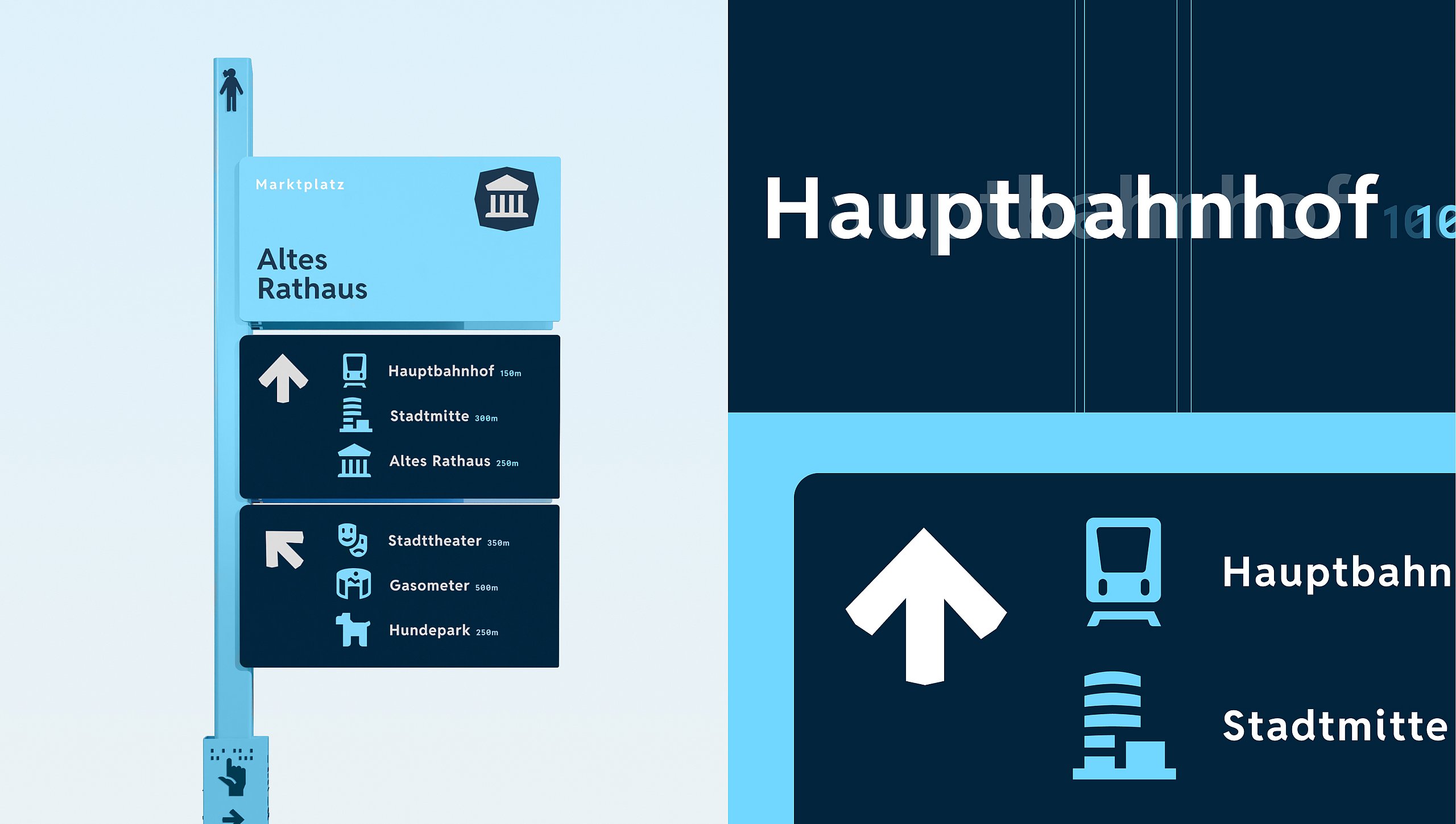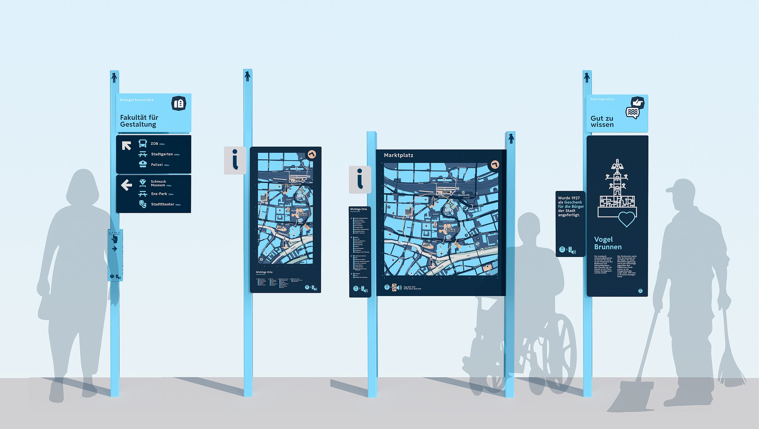 PFIN ist mehr als ein Leitsystem – es ist ein Teil der Stadt. Mit seinem authentischen, sympathischen Auftritt fügt es sich nahtlos in den urbanen Raum ein und wird zur wiedererkennbaren Identität Pforzheims. Orientierung ist jedoch individuell: Manche lesen Karten, andere folgen Symbolen, wieder andere benötigen fühlbare oder digitale Unterstützung. Genau deshalb ist PFIN inklusiv gedacht. Es verbindet klare visuelle Elemente mit taktilen und digitalen Lösungen und zeigt, dass Barrierefreiheit nicht nur notwendig, sondern auch smart, vielseitig und gestalterisch stark sein kann.