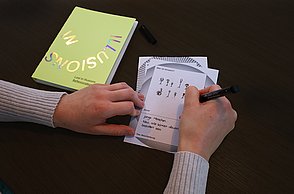 „Menschen verständigen sich zuerst über visuelle Elemente und ohne lange Texte” ist Amelie Weinert überzeugt. Viele ehrenamtliche Helfer begegnen Menschen, mit denen sie keine gemeinsame Sprache verbindet und denen zum Teil auch das Lesen und Schreiben fremd ist. Der von Amelie Kim Weinert entwickelte Ordner „Mein Deutschland” hilft, einander besser zu verstehen. Anders als bei herkömmlichen Lehrmitteln ist der Zugang spielerisch und leicht, ohne Lehrer- und Schülerhierarchie.