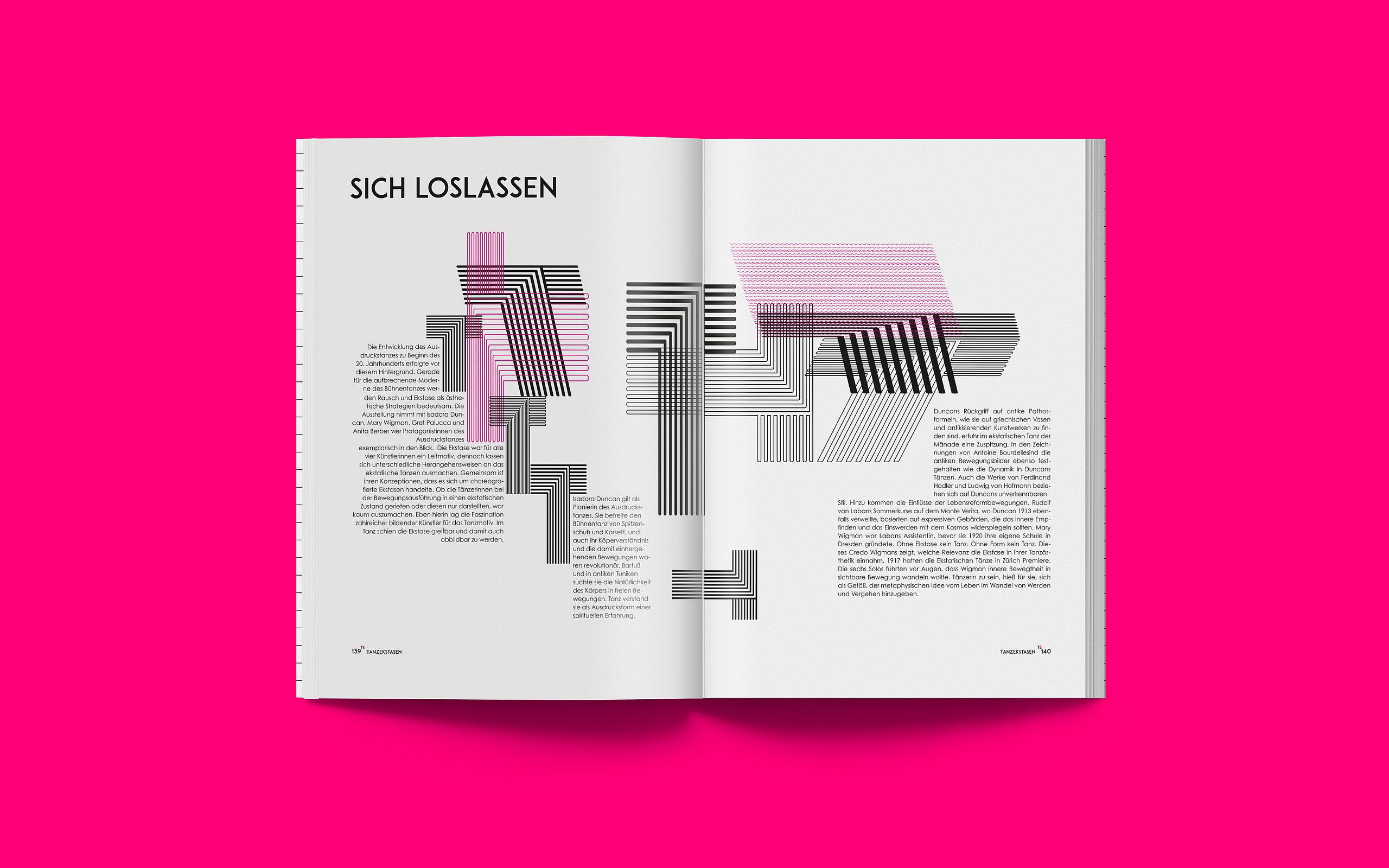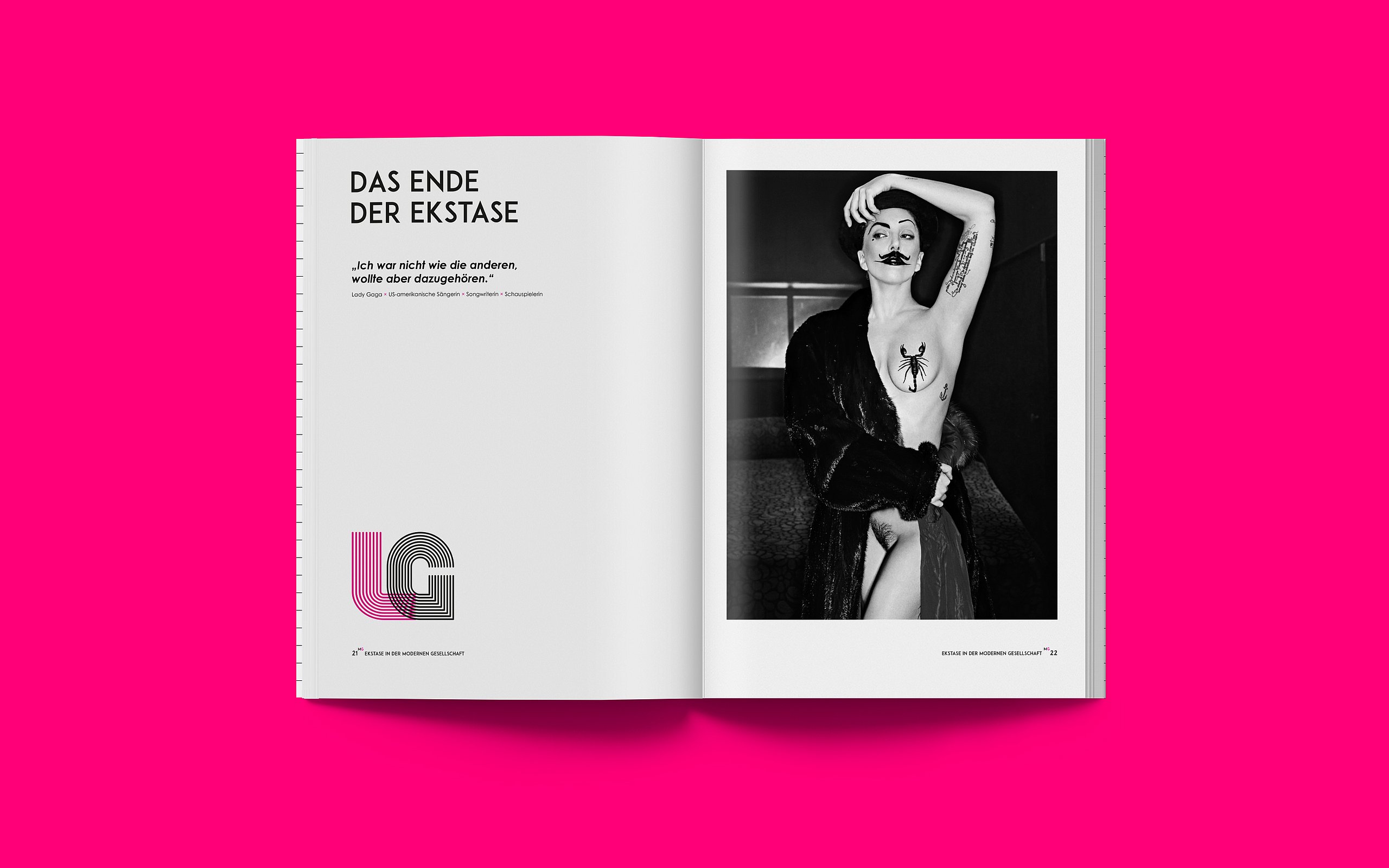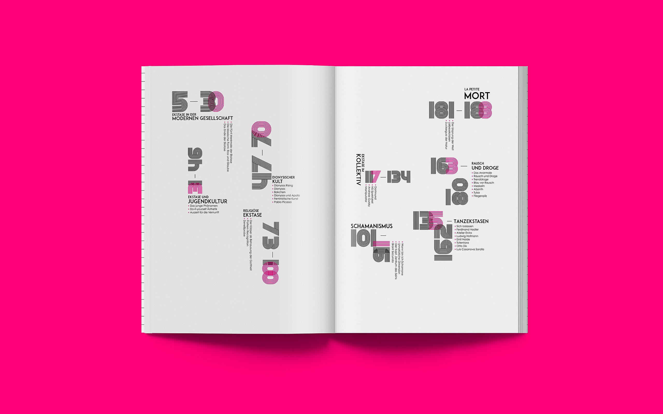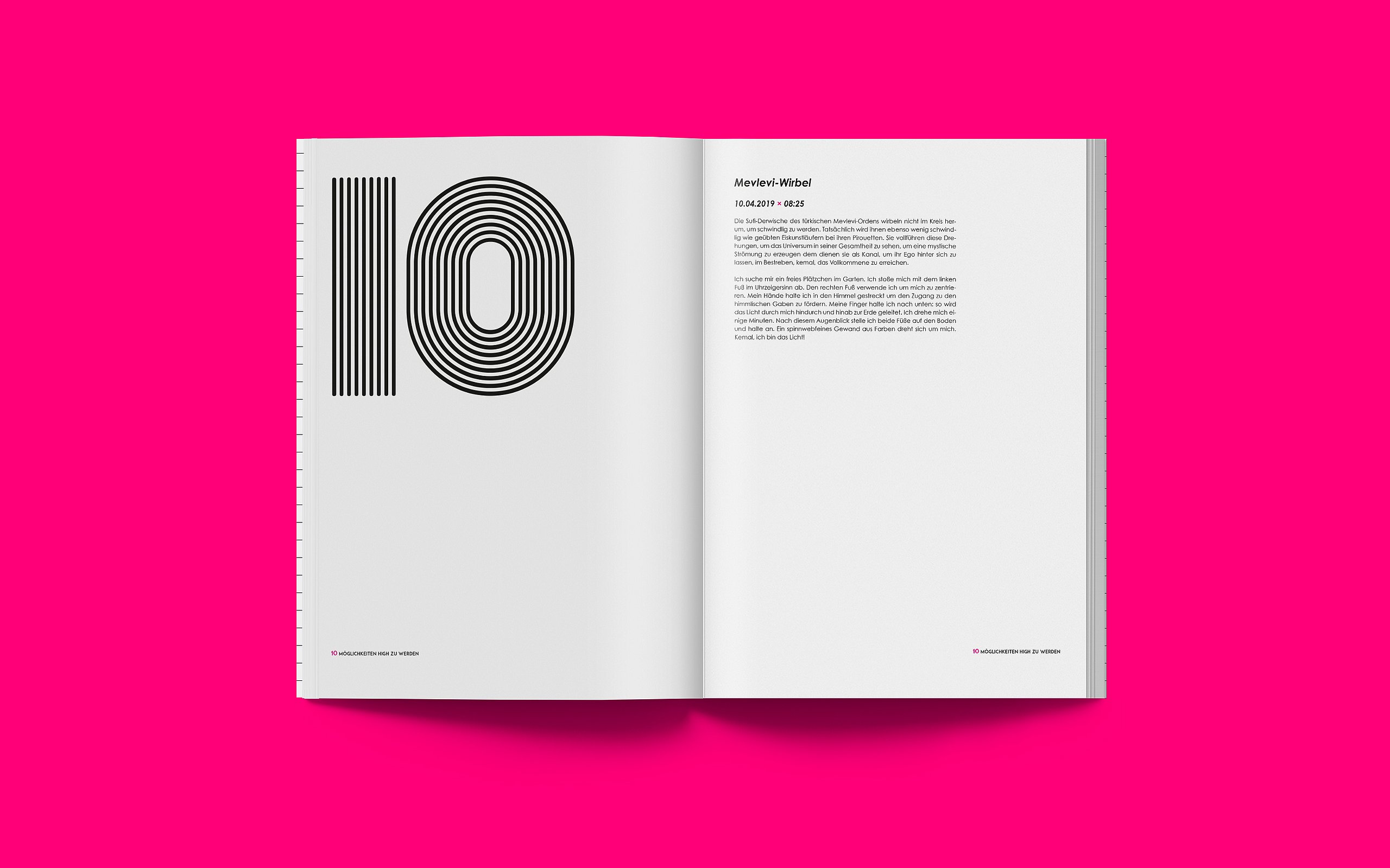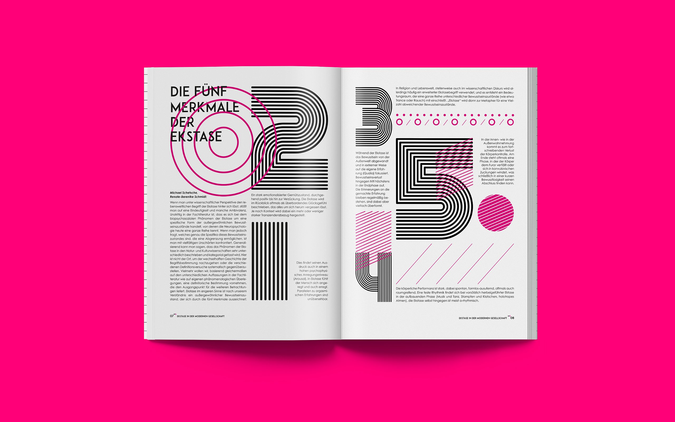 Ich stellte mich der Herausforderung, begebe mich auf die Suche nach Ekstase und wage den Selbstversuch. Das Ziel meiner Bachelorarbeit ist es eine neue Magazinreihe ins Leben zu rufen. Das „Unbenennbare“ in Form eines modernen und abstrakten Magazins kenntlich und spürbar zu machen und sich mit dem Begriff der Ekstase auseinanderzusetzen. Das erste Magazin nimmt die Form einer Retrospektive an und verfolgt die Aufgabe über all jene Ekstasemöglichkeiten zu informieren. Außerdem soll der Leser angeregt werden, dem Begriff der Ekstase mutig und ohne Scham gegenüber zu stehen und den Selbstversuch zu wagen. Es plädiert dazu, den Zustand der Ekstase auf natürliche Art und Weise zu konsumieren. Das zweite Magazin hat den Schwerpunkt der Religiösen Ekstasen und das dritte handelt vom Reiz des Drogenkonsums. Die Erfahrungen, die ich mit den Selbstversuchen gemacht habe, kann ich als durchaus positiv bewerten. Bei keinem der Selbstversuche habe ich Drogen oder andere Substanzen konsumiert. Die Schwierigkeit war den Moment der Ruhe zu finden und ihn zu akzeptieren. Gedanken und Hemmungen zu verlieren und sich nur auf den eigenen Körper zu konzentrieren. Ich habe in all den Momenten der Selbstversuche jegliche Art von Emotion spüren dürfen. Ob Entspannung, Wut, Traurigkeit oder Freude. Auch an den Punkt der Ekstase bin ich geraten, auch wenn er noch so kurz und wenig intensiv war. Durch die Selbstversuche und die Menschen, die ich dadurch kennenlernen durfte, hat sich mein Wissen zum Thema Ekstase unheimlich vergrößert. Ekstase hat mir gezeigt, dass sie im Stande ist Raum und Zeit zu verändern. Außerdem verschafft sie dem Menschen Auszeit und Ruhe und empfiehlt zu hohe Erwartungen und Druck zu vermeiden. Mit innerer Ruhe und Ausgeglichenheit lässt es sich nämlich viel schöner und einfacher Leben. Aber auch der Kreativität kommt es zu Gute. Deshalb meine Botschaft an die Menschen dort draußen. Konsumiert die legale Droge Ekstase, wenn nicht habt ihr was verpasst im Leben!