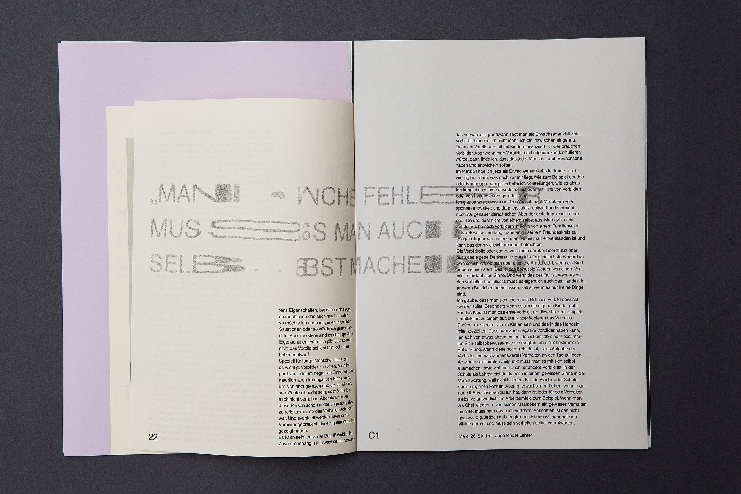 Fehler gelten gemeinhin als Störung und als Zeichen des Versagens. Doch was, wenn gerade das Misslingen zum entscheidenden Impuls kreativer Prozesse wird? Diese Arbeit untersucht Fehler als gestalterisches Potenzial, das nicht nur toleriert, sondern bewusst gesucht und eingesetzt wird. Auf Grundlage theoretischer Modelle und einer eigenen Umfrage wird gezeigt, wie Fehler in Kunst und Design neue ästhetische, strategische und emotionale Räume eröffnen können. Die Publikation ERRRORLOGUE übersetzt diese Erkenntnisse in ein visuelles, essayistisches und interaktives Format, das durch typografische Brüche, Reflexionen und Fallbeispiele ein kollektives Nachdenken über Fehler initiiert. Begleitend erweitern Postkarten, eine App und ein Instagram-Kanal die Publikation in den digitalen und öffentlichen Raum. Der Fehler wird nicht korrigiert, sondern zur Methode gemacht.