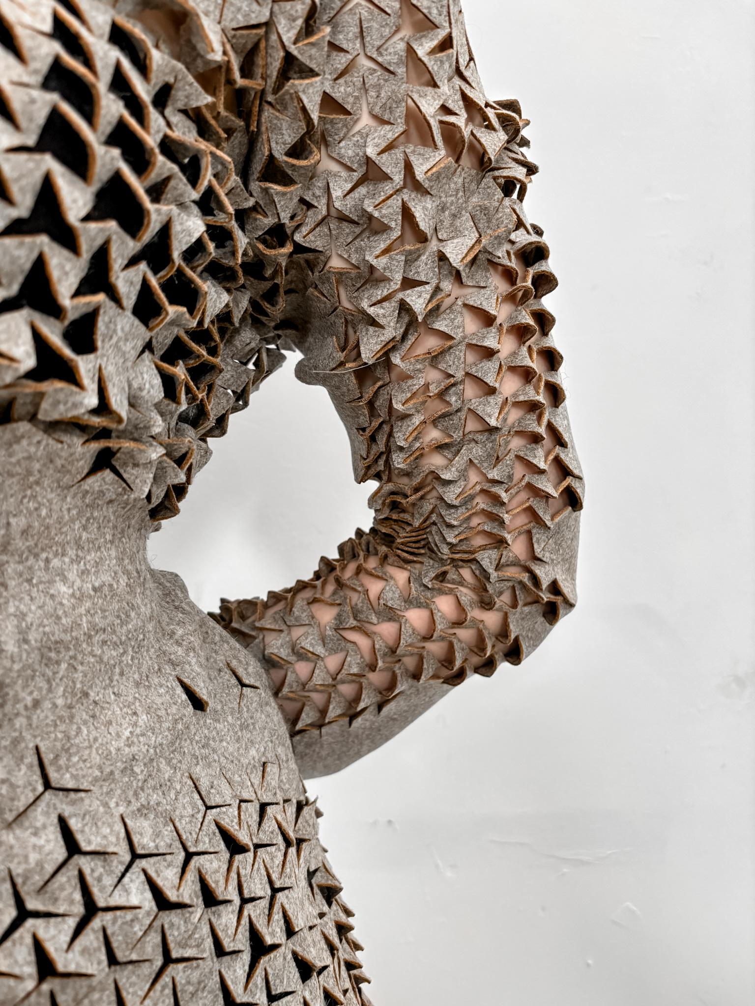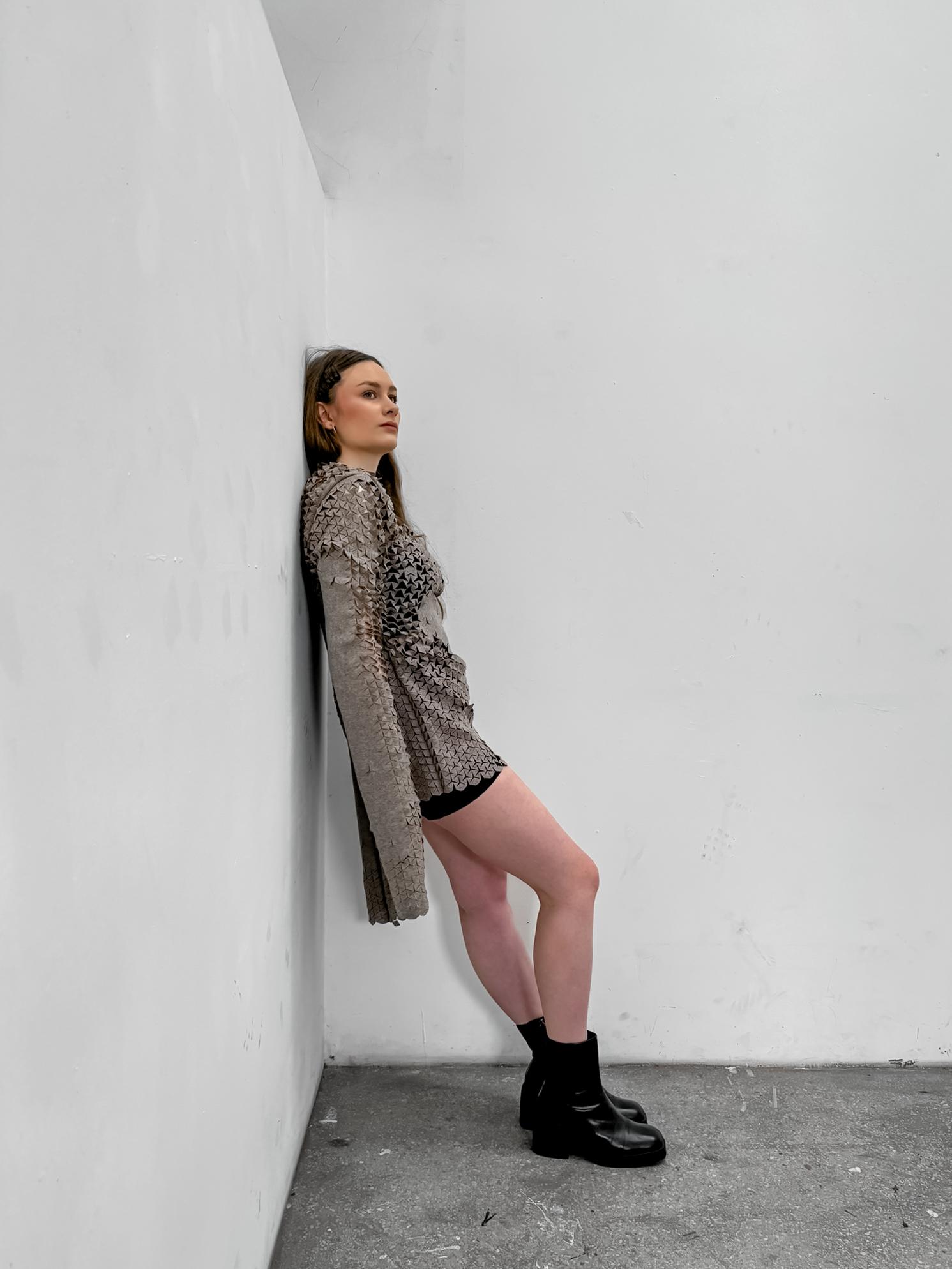 Elisabeth Spörle macht Designexperimente mit Wolle: Das Laserschneiden von Wollstoffen verbindet traditionelle Materialien mit moderner Technik. Im Fokus steht das Erforschen von Begehrlichkeit von Textilien aus Naturfasern und neue Strategien, Elastizität ohne das synthetische Elasthan in Modestoffen zu verwenden. Durch präzises Laserschneiden entstehen filigrane Muster, die den Wolltuchen der Fa. Willy Schmitz eine natürliche Dehnbarkeit verleihen und neue Möglichkeiten der Formgestaltung bieten. Mehr Bilder vom Projekt