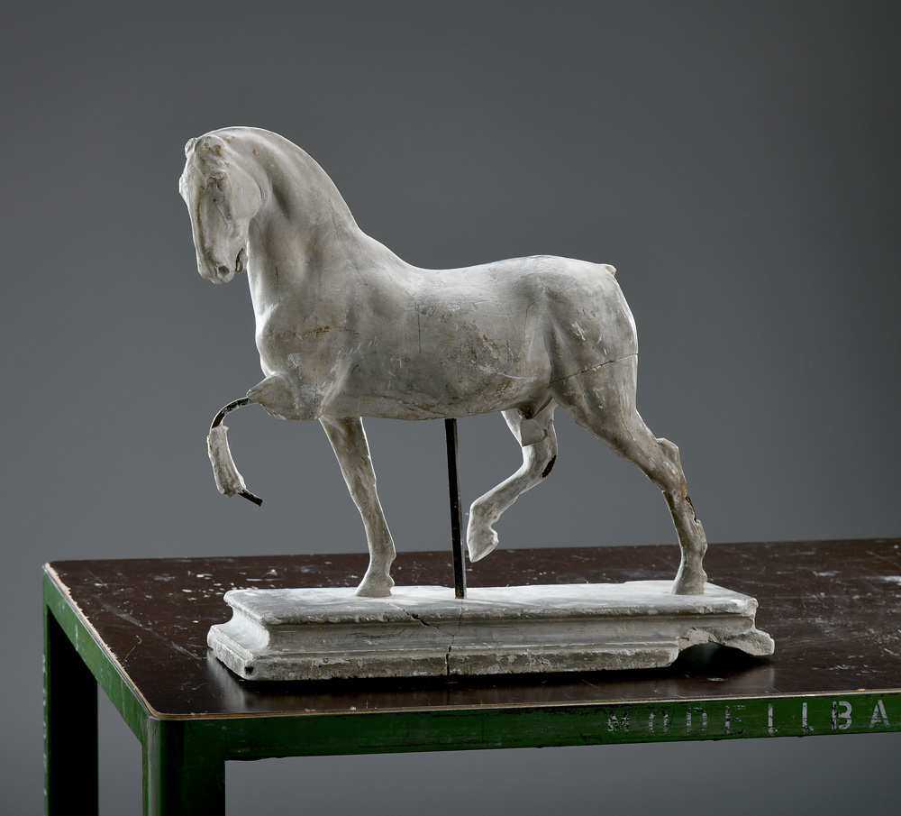 Dieses Gipsmodell eines trabenden Pferdes hat uns lange Zeit Rätsel aufgegeben. Obwohl es sich offensichtlich um ein historisches Lehrmittel aus der Sammlung der Kunstgewerbeschule handelt, findet sich am Objekt keine Inventarnummer. Diese wäre der Schlüssel für Informationen aus dem Inventarbuch zu Entwurf und Herstellung gewesen. Mithilfe alter Verkaufskataloge konnte das Pferd nun jedoch identifiziert werden: Die Dresdner Firma „Gebrüder Weschke“ produzierte in den Jahren 1894 bis 1913 das Modell „Pferd (ziehend)“ von Cloed mit der Nummer IX 26.
