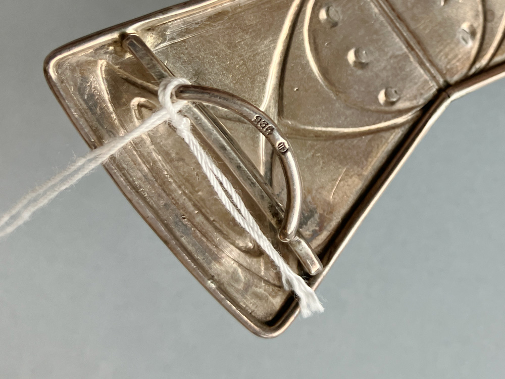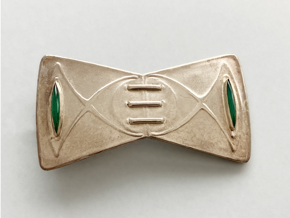 „Objekt des Monats“ im Februar 2025 ist eine besondere Schülerarbeit aus der Lehrmittelsammlung: eine silberne Gürtelschließe mit geometrischer Formgebung des Jugendstils, die um 1905 an der Großherzoglichen Kunstgewerbeschule Pforzheim entworfen wurde. Die Kunstgewerbeschule kaufte das Schmuckstück für ihre Sammlung an und im Jahr 1906 wurde es auf der III. Deutschen Kunstgewerbeausstellung in Dresden präsentiert. Es war wohl eine mustergültige Schülerarbeit. Zudem lässt sich die Gürtelschließe durch das Markenzeichen „TF“ auf der Rückseite der renommierten Schmuckfirma Theodor Fahrner zuordnen. Wahrscheinlich sollte die Schließe in die Kollektion aufgenommen werden. Ein faszinierendes Beispiel für den Austausch zwischen Kunstgewerbeschule und Industrie.