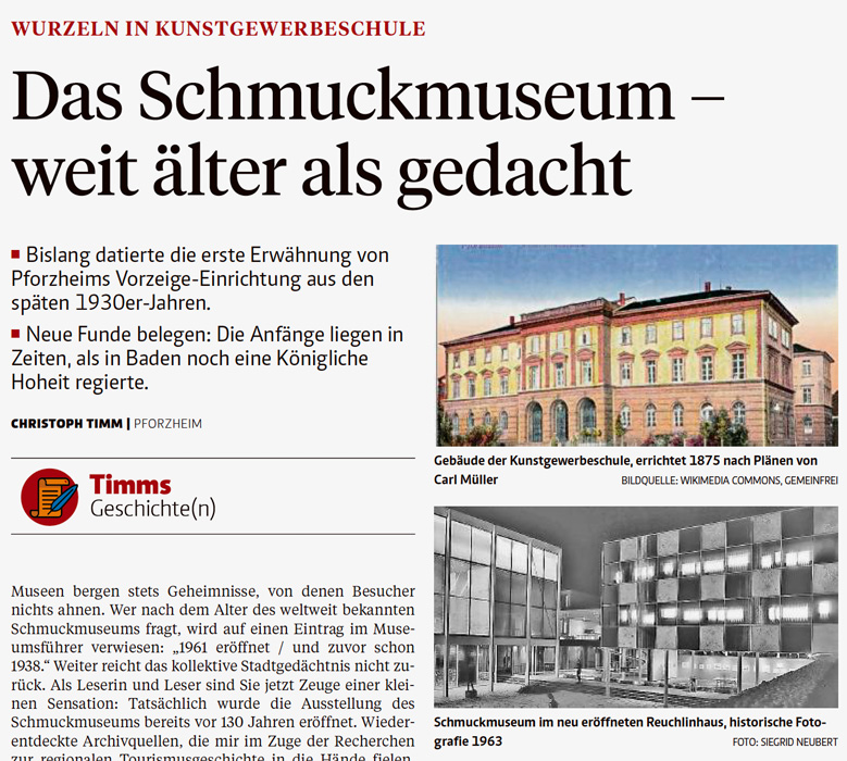 Verbundpartner ist das Schmuckmuseum Pforzheim. Das Schmuckmuseum Pforzheim ist weltweit das einzige Museum in öffentlicher Hand, das sich ausschließlich dem Schmuck widmet. Seine Sammlungen umfassen tausende historischer und moderner Schmuckstücke – Originale aus fünf Jahrtausenden, von der Ur- und Frühgeschichte bis zur Gegenwart. Schwerpunkte liegen auf Kleinodien der griechischen und etruskischen Antike, der Renaissance und des Barocks. Herausragend sind die Preziosen aus der Zeit des Art Nouveau und Jugendstils sowie die einzigartige Kollektion moderner Schmuckkunst ab 1960. Die ethnografische Sammlung Herion gibt Einblick in schmückende Ausdrucksformen außereuropäischer Gesellschaften, und Taschenuhren aus der Sammlung des Pforzheimer Uhrenfabrikanten Philipp Weber dokumentieren Uhrmacher- und Goldschmiedekunst vom 17. bis ins 19. Jahrhundert. Den historischen Grundstock des Museums bildet eine umfassende Ringsammlung, die ursprünglich Teil der Lehrmittelsammlung der Pforzheimer Kunstgewerbeschule war.