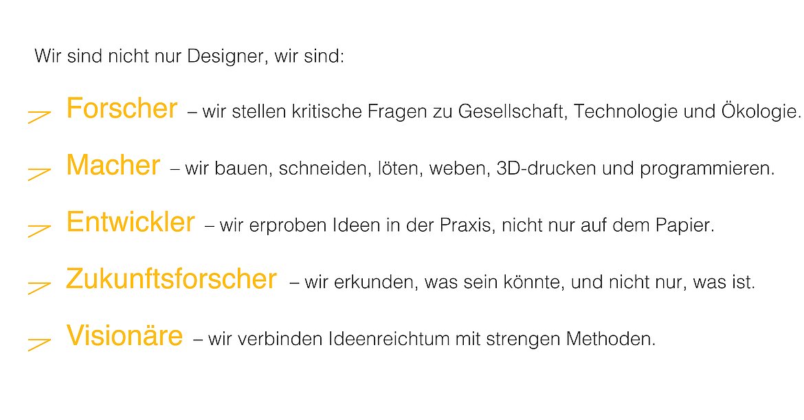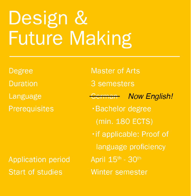 Er bietet einen experimentellen und produktiven Raum für Menschen, die Design als Methode nutzen möchten, um Systeme zu verändern – und nicht nur, um sie zu verschönern. Der Studiengang richtet sich an Interessierte aus den Bereichen Design, Kunst, Architektur und Technologie, die über die klassische Designpraxis hinausgehen und ihre eigene forschungsorientierte Position entwickeln möchten.