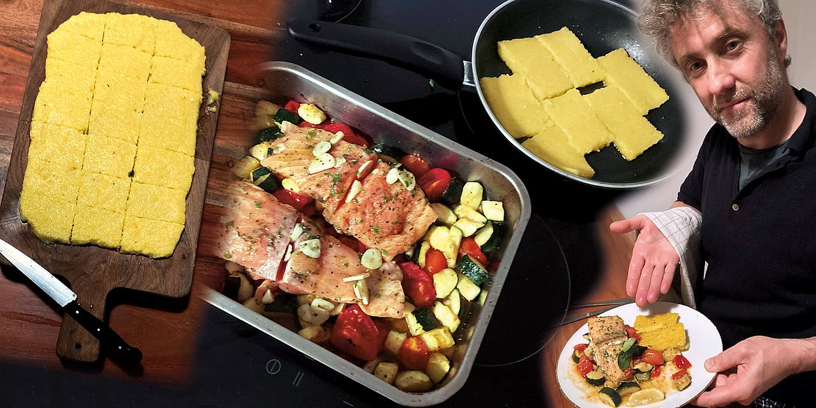 Die Polenta sollte jetzt ziemlich ausgekühlt sein. Wer schlau ist, hat die Polenta schon am Vorabend vorbereitet und in Schnitten geteilt. Die Schnitten jetzt mit Olivenöl anbraten oder in einer zweiten Form mit in den Ofen schieben.