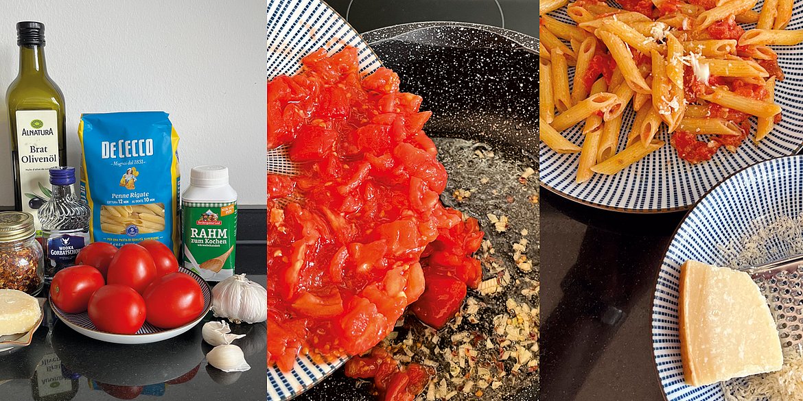 - Mit dem Wodka ablöschen und kurz einköcheln lassen, dann die kleingeschnittenen Tomaten dazu geben und auf kleiner Flamme ca. 10 Minuten dahinköcheln lassen.