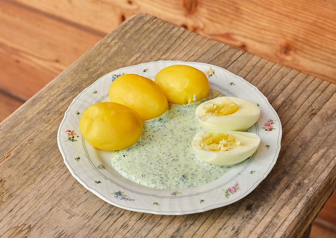 In einer großen Schüssel verrühre ich dann die saure Sahne und den Schmand (oder Joghurt) zu einer glatten Masse. Zwei hartgekochte Eier werden geschält, fein gehackt oder durch ein Sieb gestrichen und unter die Soße gemischt. Dann kommen die gehackten Kräuter dazu. Die Mischung wird mit einem Teelöffel Senf, Salz, Pfeffer und etwas Zitronensaft oder Essig abgeschmeckt – wer mag, kann noch eine Prise Zucker hinzufügen.