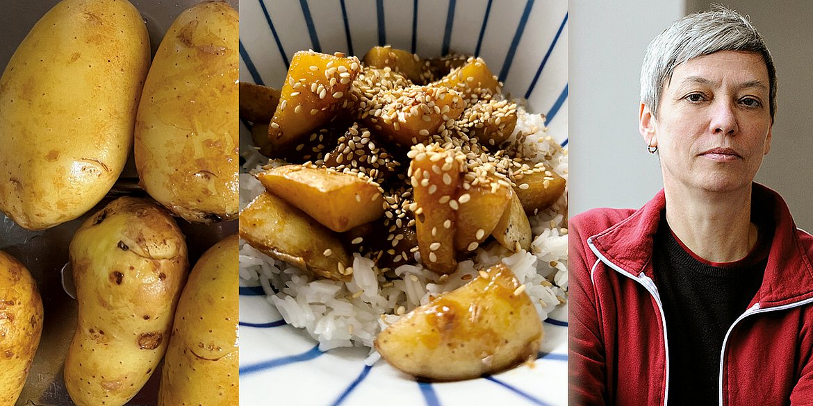 Sojasauce, Zucker und Mirin miteinander vermengen und dazugeben und gut mit den Kartoffeln vermischen. Anschließend Wasser dazugeben, bis alle Kartoffeln bedeckt sind und kochen. Immer wieder etwas Wasser dazugeben, bis alle Kartoffeln gar gekocht sind.