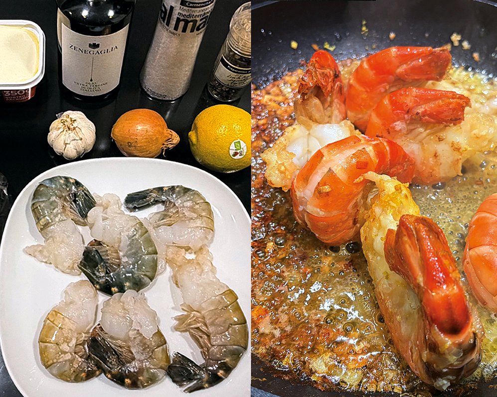 Geschnittene Zwiebeln und Knoblauch in der Pfanne andünsten und ca. 50 g Butter hinzugeben. Riesengambas in die Pfanne geben und anbraten. Etwas Zitronenscheibe in die Pfanne reiben. Etwas Tagliatelle Wasser in die Pfanne geben.