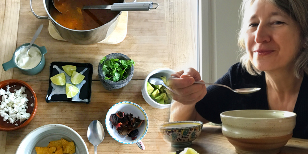 Christine Lüdeke: „Als ich nach Italien kam, sind meine Eltern fast zeitgleich nach Mexiko ausgewandert (meine Mutter war eine Mexikophile – dass mein Papa mitging, ist eine andere Geschichte). Als wir sie zum ersten Mal besucht haben, sagte meine Mama: ‚Christine, das ist die beste Suppe der Welt‘. Und wie das so ist, Mama hatte recht. Die Suppe ist magisch. So gut für die Seele! Ab und zu kochen wir sie in Sufers, Graubünden, bei den jährlichen Feuer-Workshops mit dem Studiengang Schmuck – und so schließt sich der Kreis, denn Sufers ist die Heimat/ der Heimatort meiner Mama.