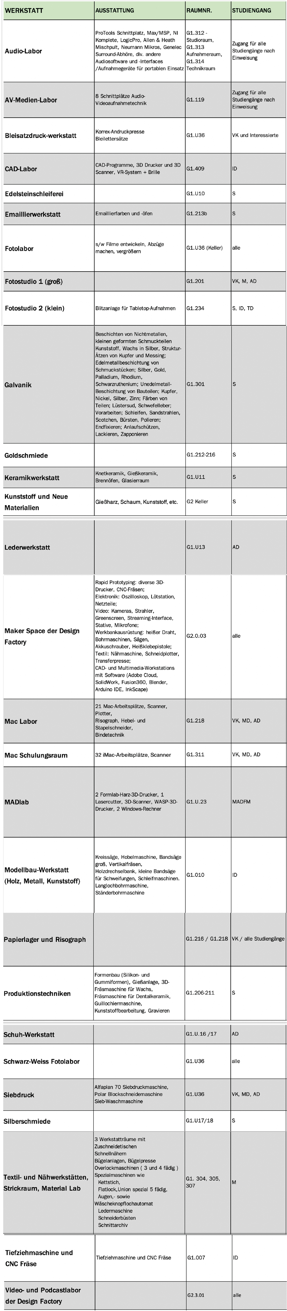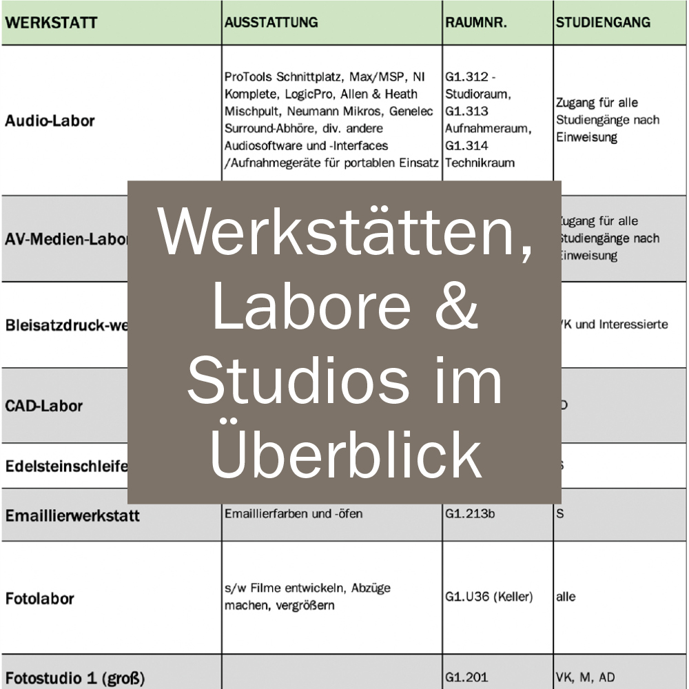 Die Öffnungszeiten, Zugangsvoraussetzungen, Ansprechpartner*innen und Kontaktmöglichkeiten der einzelnen Werkstätten sind für Hochschulmitglieder sind über diesen Link im internen Bereich auf dem e-Campus nachlesbar.